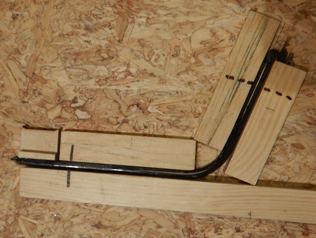 Vlastní stěžeň je složený z uhlíkové trubky 6/5 mm, nahoře je trubka 5/4 mm a výložník (crane) je vylaminovaný z uhlíkového provazce do zvoleného tvaru a vsazený do horní trubky. Crane můžeme vyrobit tak, že do hadičky zatáhneme uhlíkový provazec přehnutý na polovinu a prosycený pryskyřicí, hadičku v jednoduché „formě” tvarujeme do žádaného tvaru. Po vytvrzení hadičku podélně rozřízneme a máme tvarový kus. Trubky jsou v místě vsazení dalšího prvku zpevněny omotáním šňůrou Dyneema, prosycenou vteřinovým lepidlem.