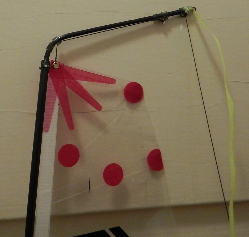 Další operací je nalepení výztuh zadního lemu (vzpíry), které pomáhají držet tvar profilu plachty. Používám různě silný průhledný plast například z obalů, tuhost je třeba vyzkoušet. Na připravený pásek nalepím oboustrannou lepicí pásku a umístím na plachtu. Po nalepení těchto výztuh je čas na další zpevnění plachty. Tady přijde ke slovu opět samolepící Skytex různých barev od výrobců padáků. Využívám možnosti vyříznout potřebné tvary na laseru, a to kolečka a protáhlé trojúhelníky. Na obou plachtách vyztužíme rohy plachty lepením trojúhelníčků střídavě z obou stran do růžice tak, aby se síla z úchytu roznesla do materiálu.