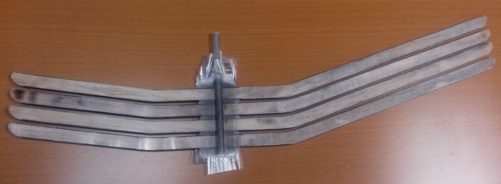 Následuje vyztužení předního lemu obou plachet, opět platí, že výztuha nesmí plachtu zbortit. Situaci komplikuje fakt, že musíme respektovat 3D tvar plachty a proto si musíme vyztužovaný lem plachty správně „nastavit”. Výztuhy jsem zkoušel provést pomocí pásky na pečící papír (neprotahuje se), případně ze samolepícího Skytexu. Abychom do výztuže nevnesli nežádoucí napětí, tak postupujeme podobně jako při lepení dílů plachty, kdy si fixujeme materiál výztuhy ideálně opatřený na lepivé straně krycí vrstvou, obdobně si připravíme plachtu a zafixujeme. Lepíme tak, že plachtu opatrně nadzvedneme, odstraníme krycí vrstvu a následně plachtu uvolníme a lepíme (po kontrole spoj domáčkneme například přejetím ložiskem). U kosatky je možné ze Skytexu vytvořit „tunel”, kterým potom vede přední stěh. Případně si nařežeme kousky trubičky, například vnitřek plastového bowdenu a nalepíme na vyztužený přední lem s roztečemi cca 100 mm.