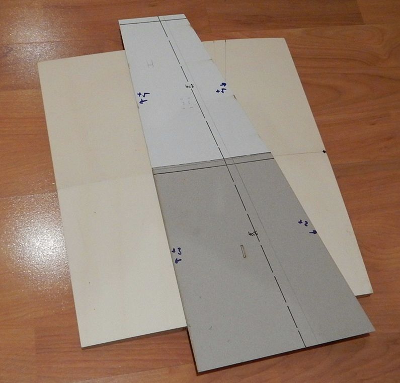 Jakmile máme připravené všechny díly s nalepenou páskou, můžeme přikročit k lepení. Já používám přípravek „želva”, vyrobený z překližky. Zde máme možnost volit různý profil plachty a sklon segmentů, možností je opravdu hodně. Sousední díly plachty si ustavíme na přípravek tak, aby značky vrcholu profilu byly ve správném místě a aby odpovídala pozice spoje. Na obrázku je ilustrativní ukázka dvou dílů na přípravku, ale jedná se o papírové šablony, díly z průhledné folie jsou nevyfotitelné. Kraje dílů fixujeme například papírovou páskou k přípravku, díl bez lepicí pásky nadzvedneme, odstraníme krycí pásku z oboustranné lepenky a nadzvednutý díl opatrně vrátíme a kontrolujeme spoj. Pokud je vše v pořádku, tak spoj přitlačíme a stejným způsobem postupujeme s dalšími díly. Takto slepíme základní pláty plachet, které již mají patřičný profil. Podle půdorysného střihu si vyznačíme linie hran a přesahy na předním a zadním lemu ořízneme.