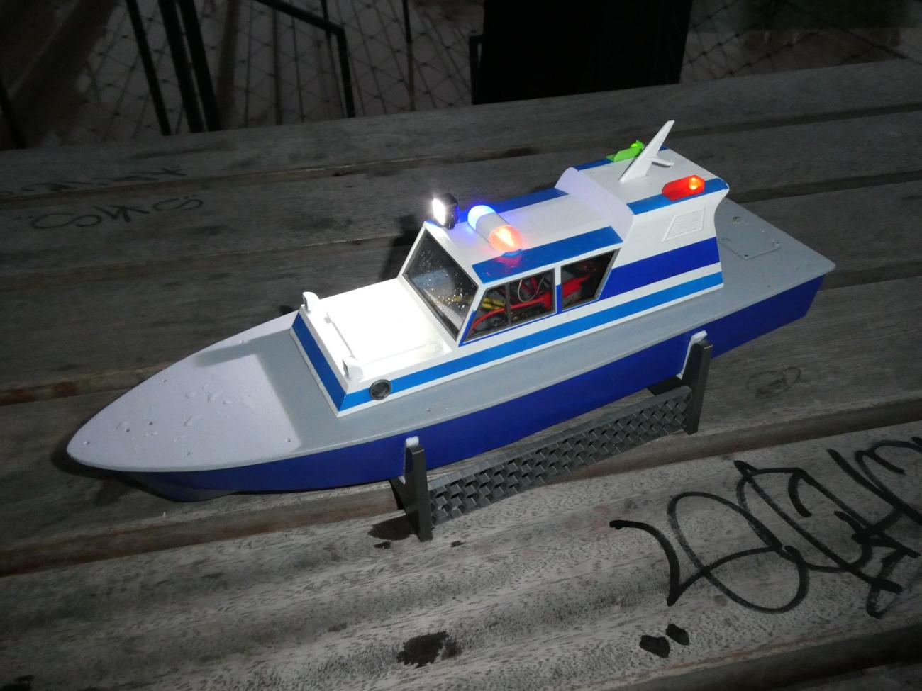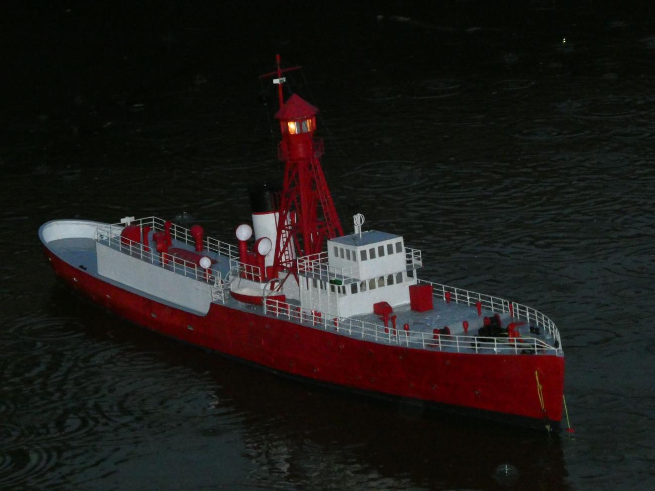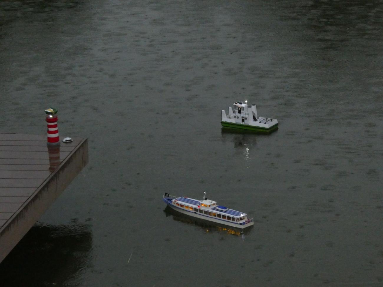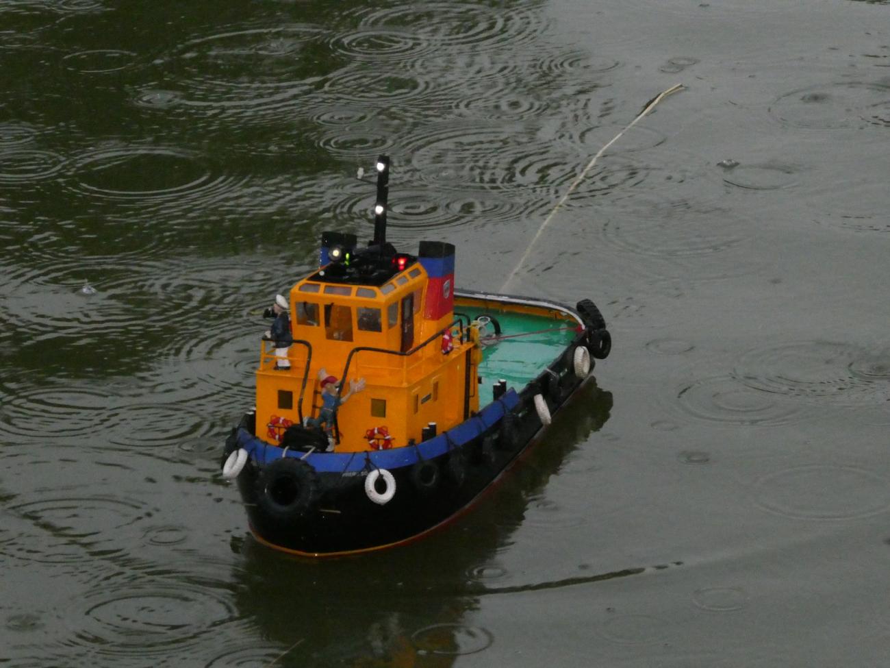 Moji pozornost pochopitelně upoutala opravená majáková loď. Než ji Dejv položil na vodu, změřil hloubku vody, aby měl lepší představu, jestli mu bude stačit přichystaná kotva. Majáková loď stála na svém místě a tentokrát do ní nikdo nenarazil, což s ohledem na to, že některé modely ovládaly Svennyho děti, příjemné zjištění. Jen je škoda, že v dešti nejsou mnou pořízené snímky bůhvíjaké, což se týká i snahy zachytit další přítomné modely.
