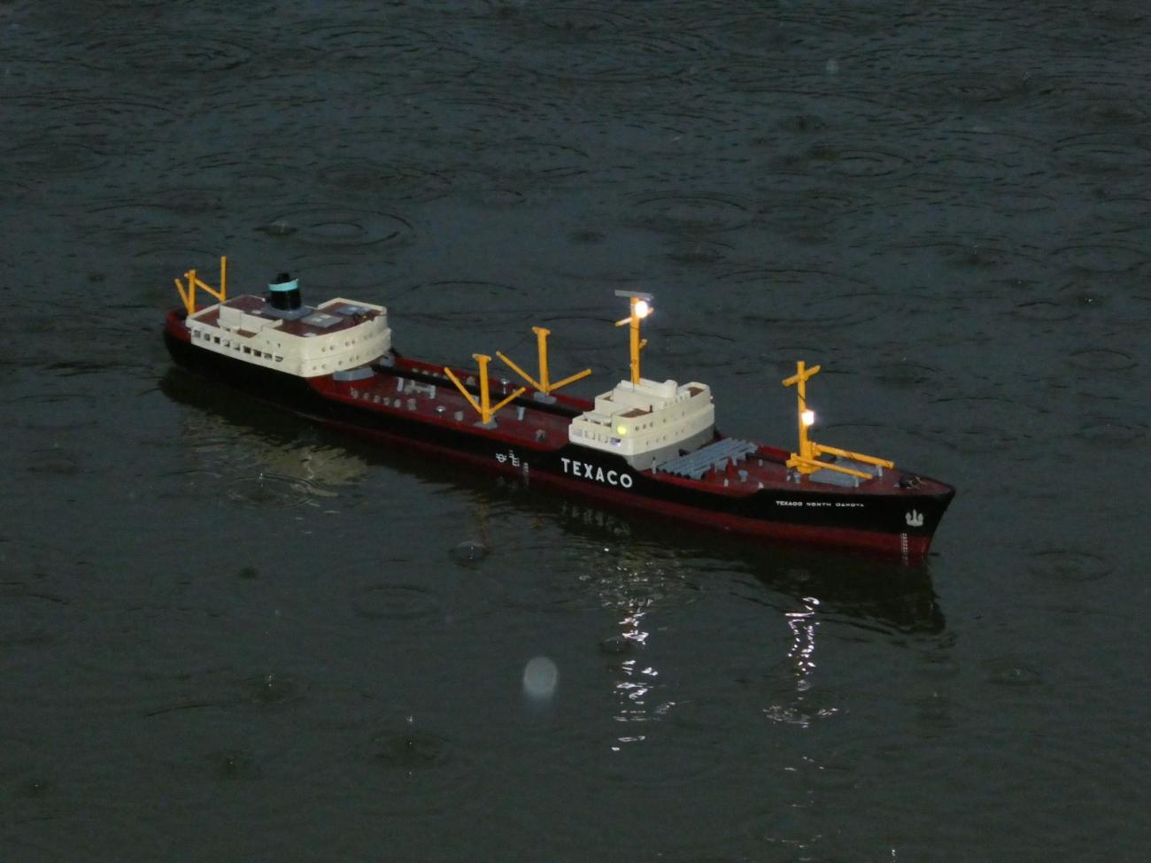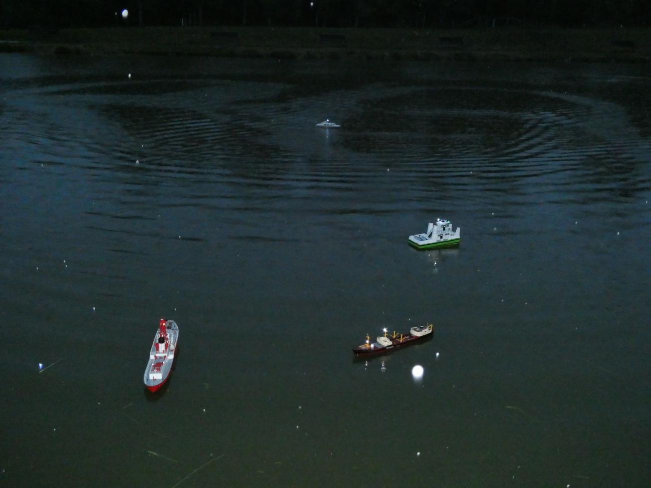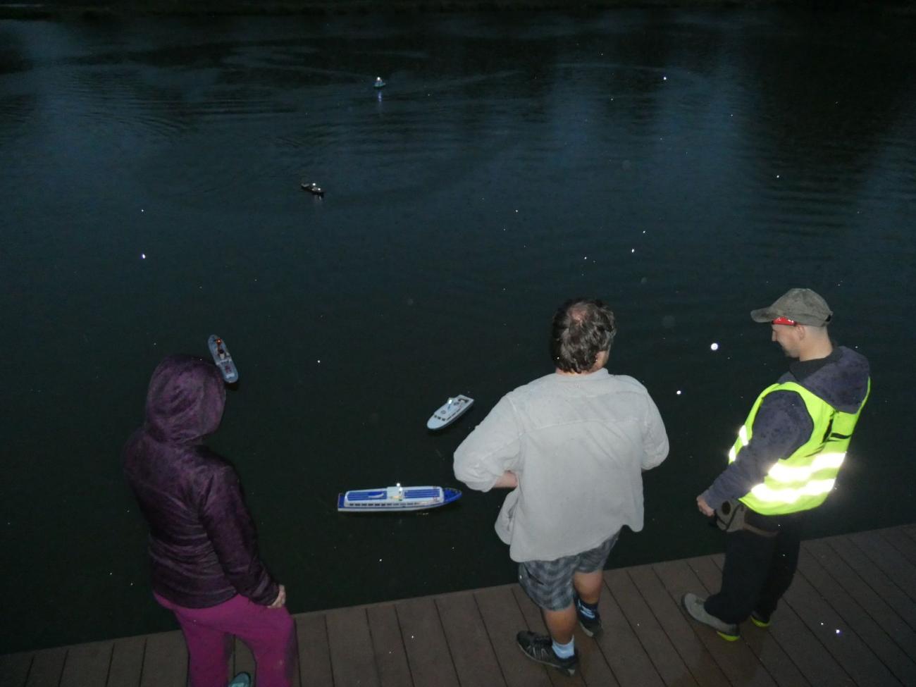 V minulém roce jsme se u Požárního rybníka v Běchovicích na okraji Prahy sešli až koncem srpna, kdy bylo krásně. Dva roky zpátky nám podobný termín začátkem srpna propršel stejně jako ten letošní. Tehdy tedy pršelo skoro celý den, letos začalo až k večeru, což na věci nic nemění, jelikož začínáme jezdit až před setměním, protože osvětlené lodní modely vyniknou až za tmy.