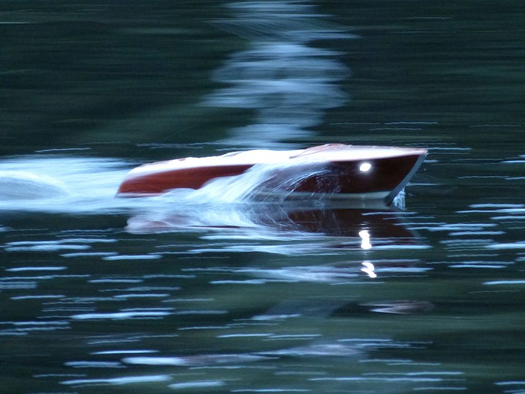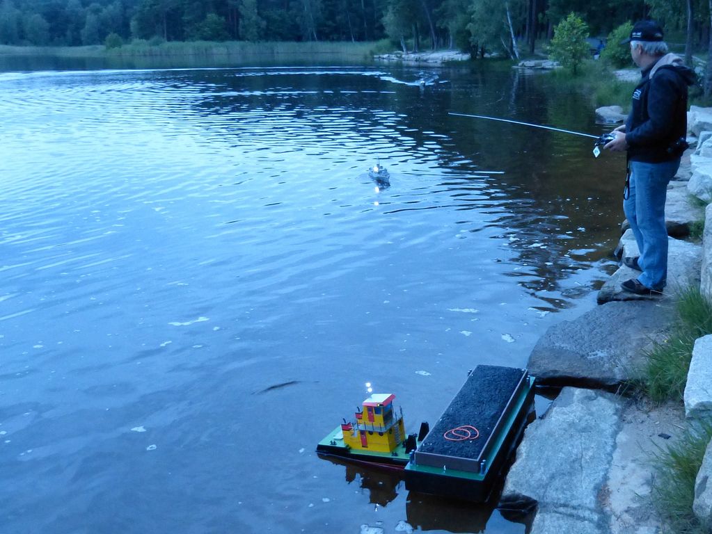 V pátek 20. července 2012 jsem celý den sledoval vývoj počasí, abych vpodvečer s klubovým kolegou Bohoušem mohl vyrazit na okraj Plzně ke Kamennému rybníku, kam Tomáš Blahůtka svolal lodní modeláře na noční jízdy. Na akci, jež začínala v osm večer, jsme vyráželi za deštivého počasí s nijak optimistickou předpovědí, nicméně déšť není ničím, co by nás dokázalo při vědomí toho, že je hned u vody hospoda, od výletu odradit .