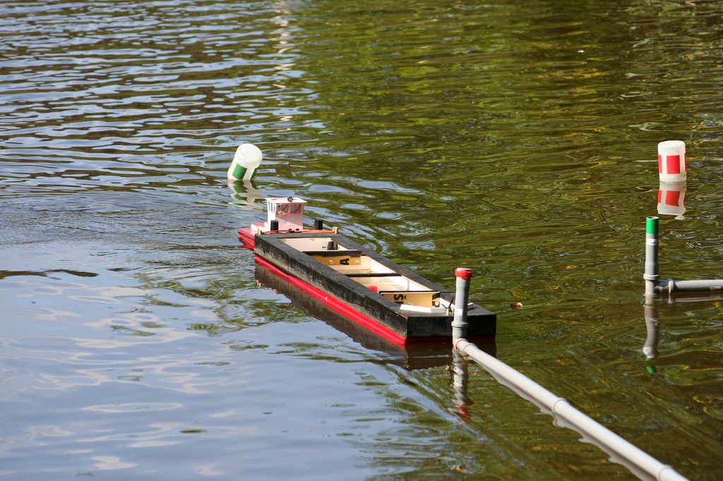 Čas však neúprosně tlačil a nechtěl ani chvilku počkat. Po průjezdu trati byl stanoven velkorysý limit 15 minut. Nezbytná porada rozhodčích, kde jsme si vyjasnili, jak kterou překážku pískat a Keba do megafonu prohlásil „5 minut do startu a odevzdejte vysílačky“. Za každou vysílačku jste vyfasovali kolíček s číslem, docela nevýhodný kšeft. Někteří si podle vysílačky nechali, ale ukázalo se být vše v pořádku, protože zamířili rovnou na trať. Lehké TT jelo tradičně s malým Kačerem (šroub byl dodán), těžké TT vyrazilo s ropnou plošinou a tlačáky s vanou od Fóglů, která je delší než tradiční. Všichni čekali na to, jak se první kapitáni popasují s tratí. Trať byla poměrně milosrdná, jen kolem majáku občas vznikla poměrně složitá situace. Občas se zvedl velký vítr a maják se rozhodl změnit místo. Proti pátku nám klesla trochu voda, což bylo na bójkách znát. Vypsaný kurs nešlo projet najednou, do některých branek se vyplatilo si udělat propagační kolečko a najet si lépe. Od samého začátku jsme zvolili naprosto nekompromisní nahánění týmů na start. V tom nám hodně pomohla Monika s Lenkou, které se staraly o počítání výsledků a organizaci před startem. Díky radiovysílačkám byl neustále přehled o tom, kdo se má připravovat, protože jakmile se tým objevil před přístavem, už jsme dávali pokyn dalšímu týmu, aby se začal připravovat. Díky tomu se nám podařilo na trati udržet čilý provoz a dodržovat časový plán. Na týmech je vidět už jejich vyježděnost a tak se žádné větší problémy nekonaly. Některé týmy se rozhodly vylézt mezi diváky na kamennou zídku, odkud bylo dobře vidět do zadního kanálu. Diváků bylo poměrně dost, ale do prostoru soutěžících neměli přístup a nejlepší výhled byl oddělen, takže jsme se vzájemně nerušili. První kolo jsme zvládli ve slušném tempu, dva týmy pravda nedokázaly vyjet ani z přístavu, ale jinak vše šlo víceméně v pohodě.