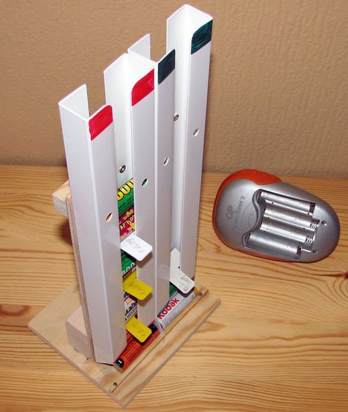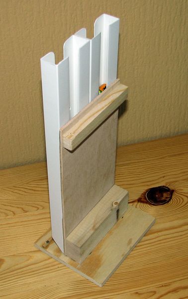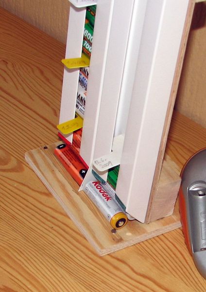 Uvědomil jsem si, že tužkové akumulátory používám většinou v sadách po čtyřech kusech a tomu vyhovuje i můj organizér. Jednoduše umožňuje roztřídit sady akumulátorů na vybité a nabité a přitom udržuje pořadí jak byly akumulátory vybity a nabity. Práce na organizéru mi trvaly zhruba dvě hodiny. Jako materiál jsem použil odřezky překližky a hranolků. Jako spojovací materiál jsem použil vruty. To nejdůležitější - plastové „U“ profily jsem koupil v jednom z těch supermarketů pro kutily.