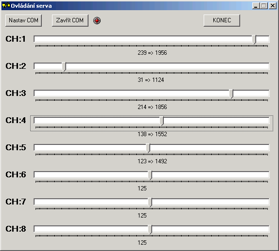 Ještě jsem upravil program na PC, kde v původní verzi byl pouze jeden posuvník a vždy se muselo vybrat s kterým servem se má