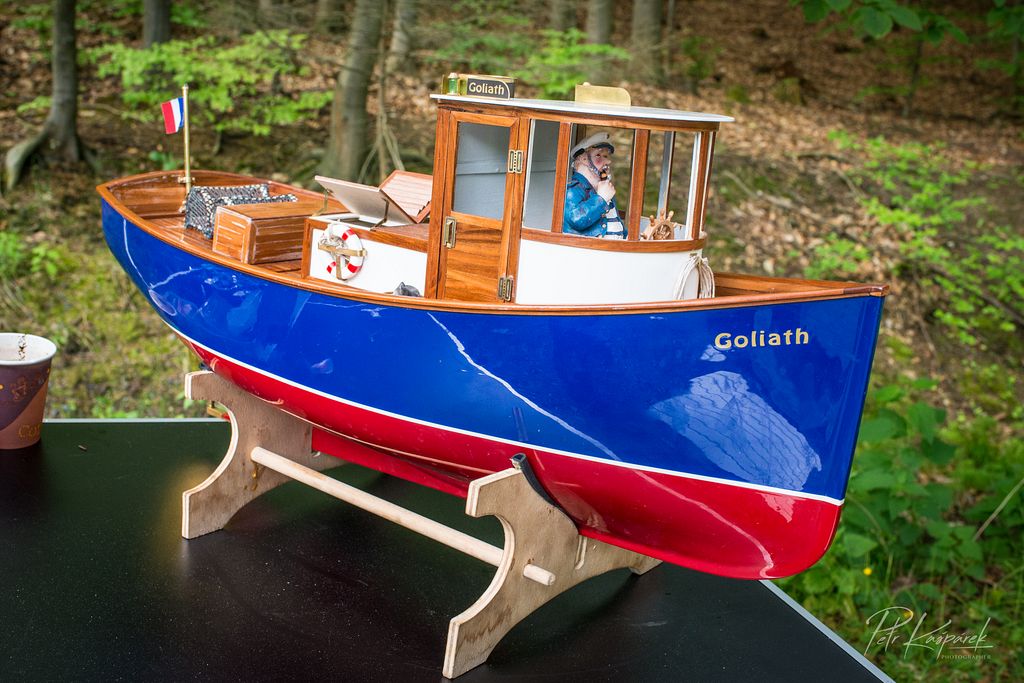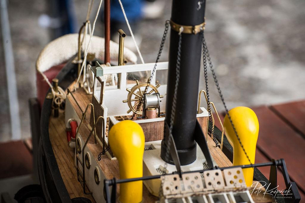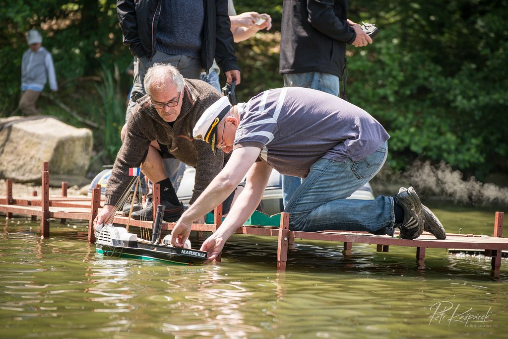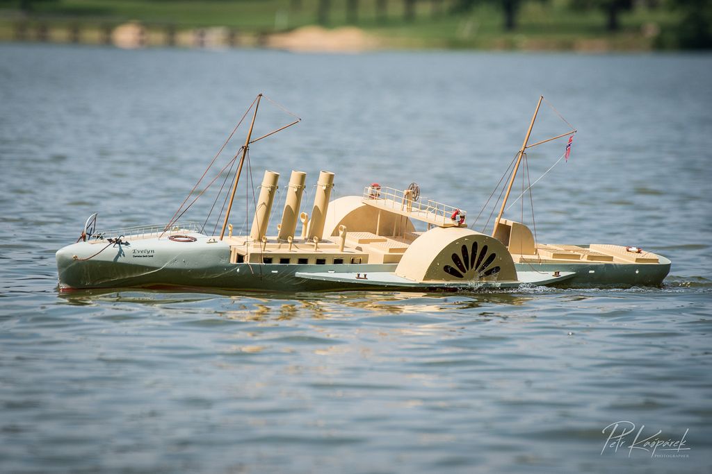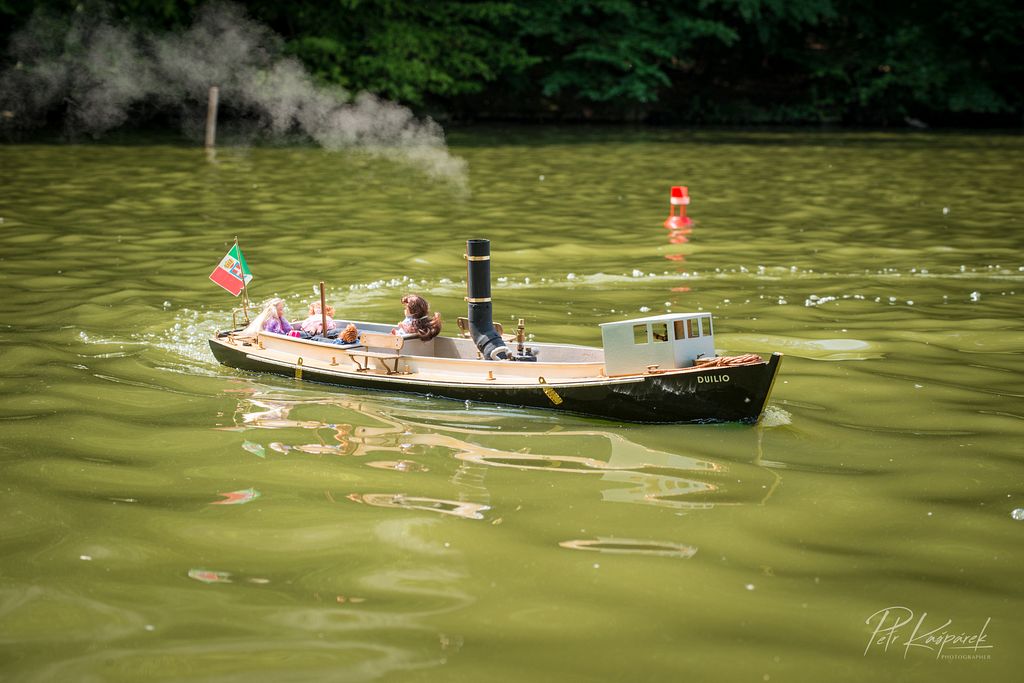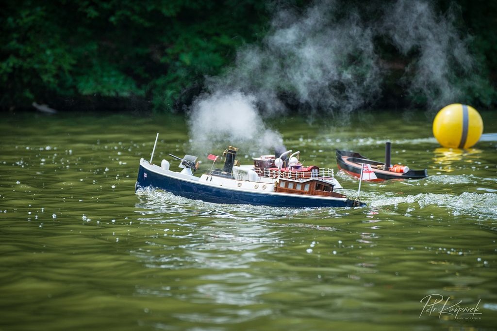 Poté do půlhodinového souboje vyplulo 13 parníků s lodním šroubem. Mezi nimi i můj Tollman, který sice rychlostní rekordy netrhá, ale vydrží plout takovou dobu. Co čert nechtěl, ještě před odstartováním se zastavil, když jsem chtěl kousek zacouvat. Až v klidu domova jsem spíše náhodou zjistil, že se na klikové hřídeli povolil červík a jeden z válců šlape naprázdno. Na stole vše fungovalo, protáčení nastalo až ve vodě.