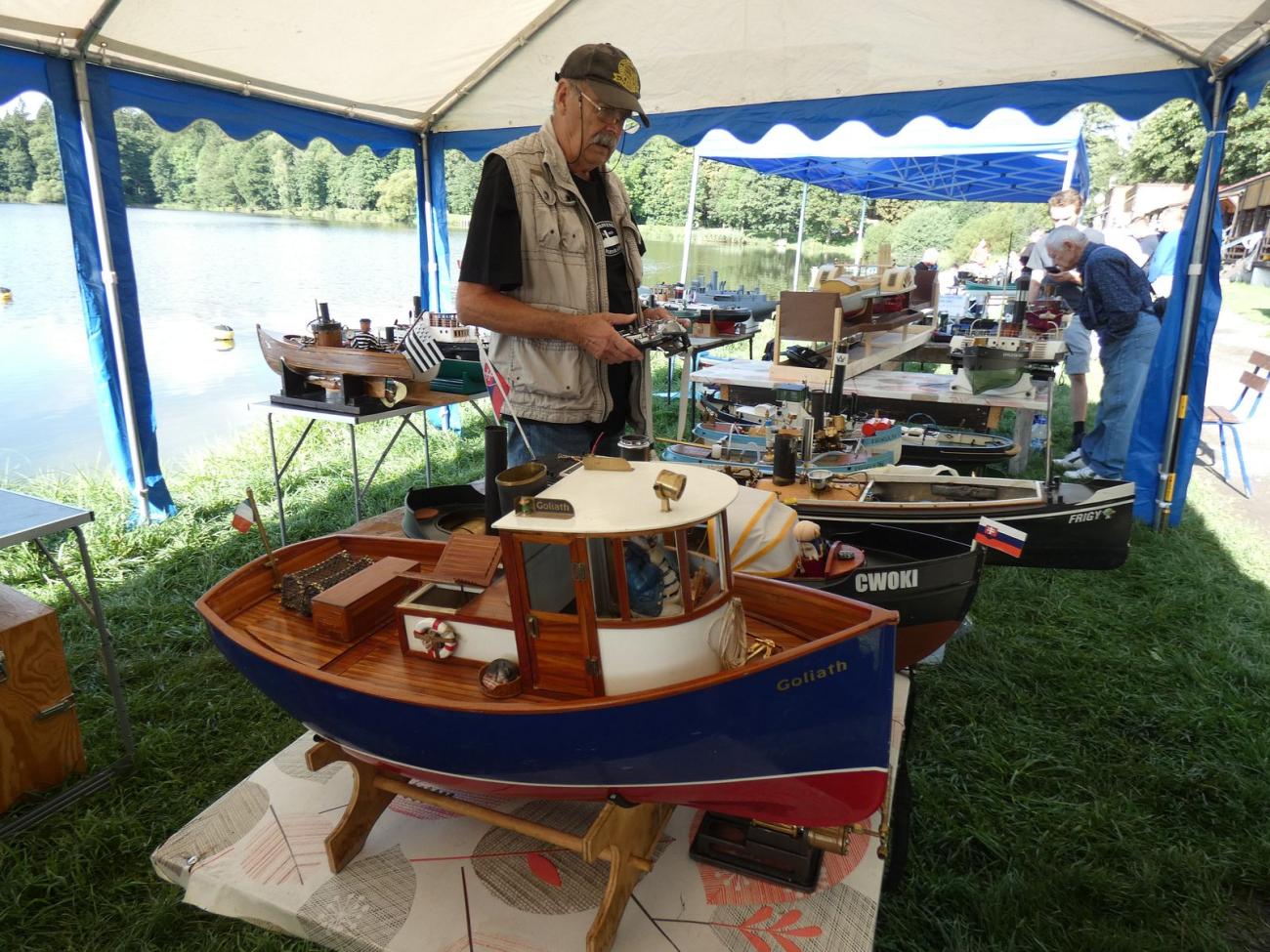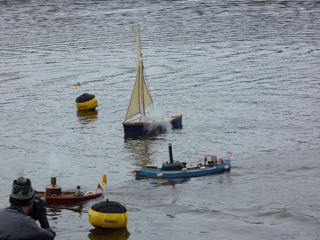 Původní představa, že u plovoucího mola postavíme velký stan, vzala rychle za své. Nevešel se. Celé startoviště se tak posunulo více vlevo a k vkládání modelů na vodu posloužila malá plážička. Plachetničkáři měli jako vždy gumovky, těm to nevadilo. Parníkáři si pomáhali vzájemně dle svých možností. Ne, že by byli líní popojít třicet metrů k molu, ale to se díky svému kolébání nejevilo zrovna vhodné k předklánění se k vodě s modelem v ruce.