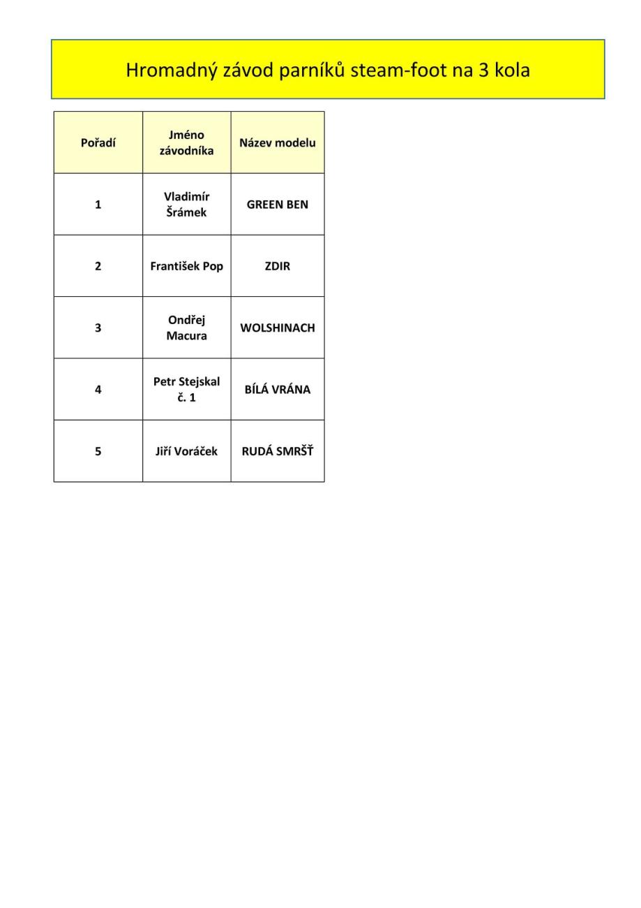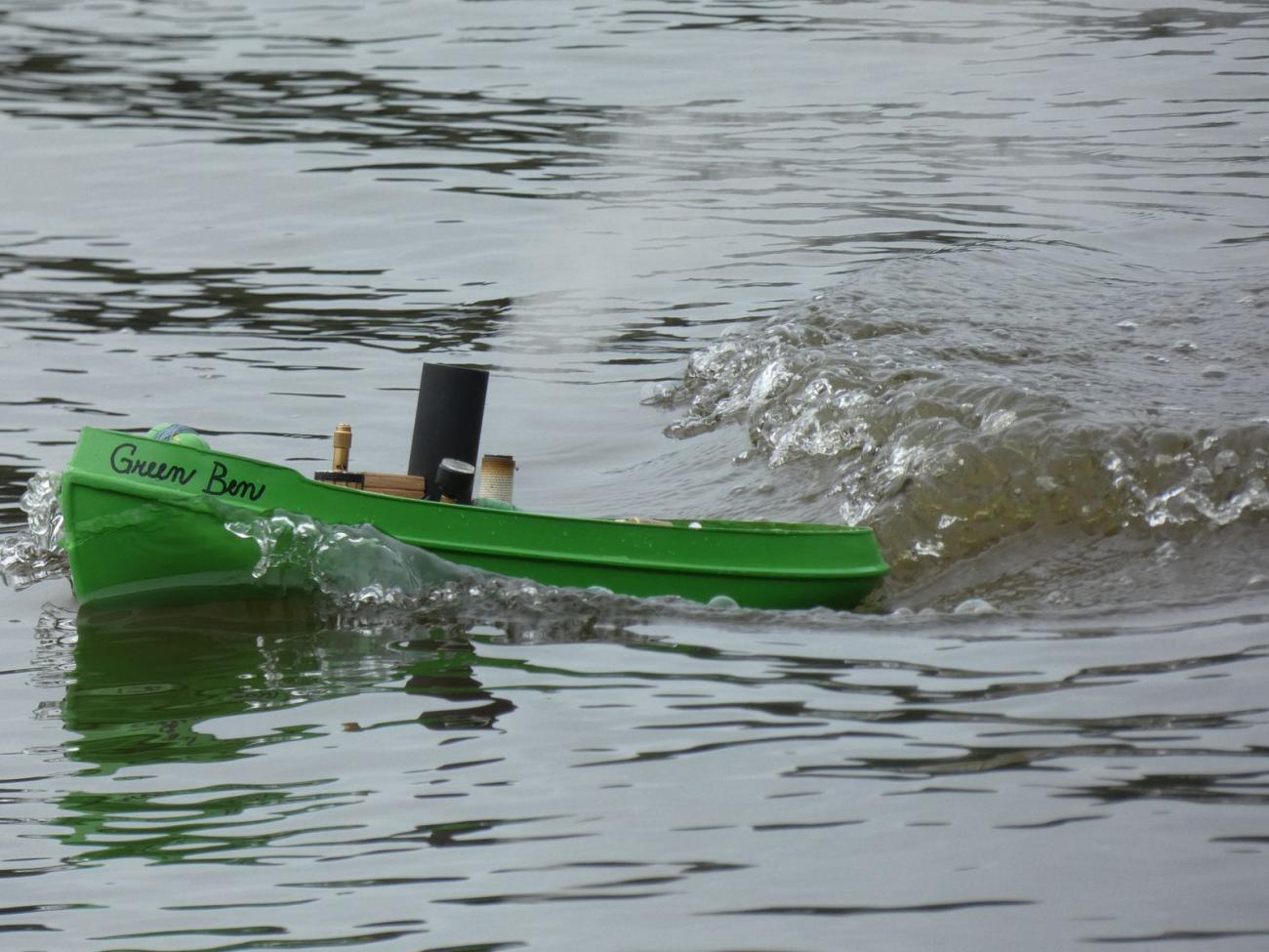 Poté již následovalo klání parníků třídy Steam Foot. S úderem startovního signálu projel startem jen jeden model, takže to pro Miroslava Beneše vypadalo velmi nadějně. Jenže za chvilku se objevil požár na palubě a bylo po naději. Metrová hořící koule vypadala dosti dramaticky, naštěstí se nikomu nic vážného nestalo. Jen Zelený Raul spolkne nějakou hodinu práce a Miroslav Beneš nemusí k holiči. Po několika minutách, které na tři kola bohatě stačí, zvítězil mezi pěti dalšími Green Ben Vladimíra Šrámka.