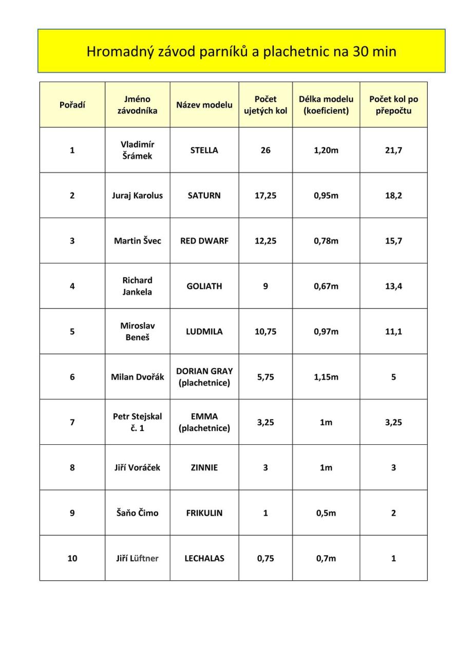 Půlhodinové klání parníků s lodním šroubem obohatily dvě plachetnice, čímž se počet startujících vyhoupl na deset. Nejvíce kol obeplula Sella Vladimíra Šrámka, a to i po přepočtu. Z 26 kol se stalo 21,7, což stále stačilo na vítězství.