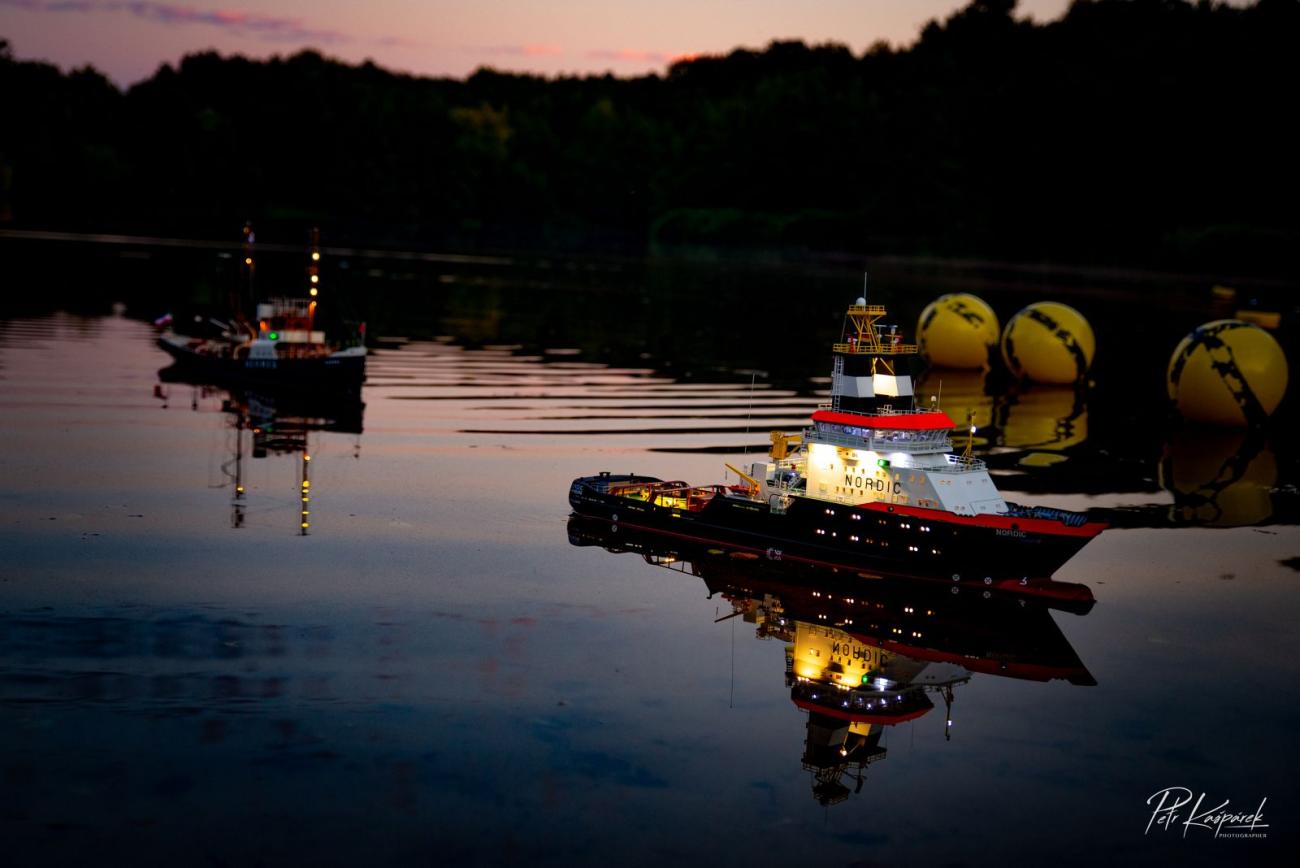 Večer bylo na programu vyhlášení výsledků. Bohužel se ve stejnou chvíli šeřilo, takže se to trochu tlouklo s nočními jízdami. V kempu byl totiž s Nordicem i Jiří Bilina a neméně pěkně efektní je za tmy parník Hermes Michala Šenekela. Sám jsem alespoň částečně stihl obojí, ostatní byli o krásu nočních jízd ochuzeni.