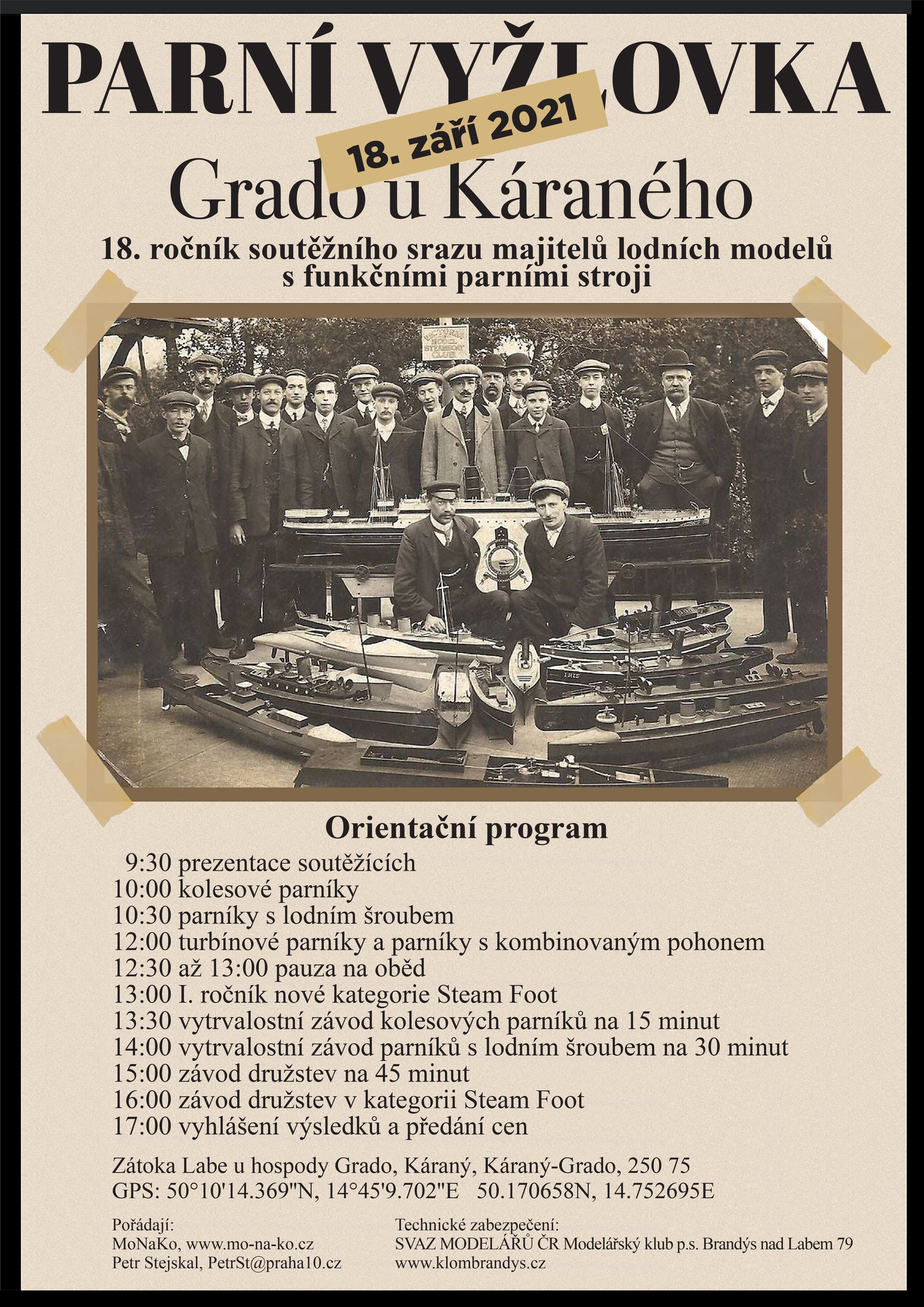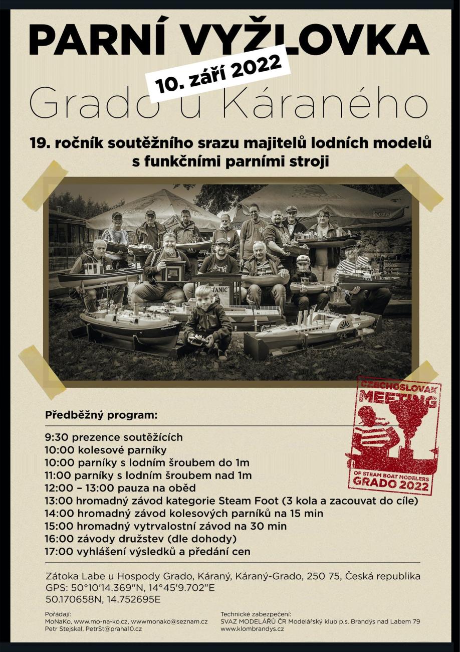 Jestli jste příznivci modelů parníků s funkčními parními stroji, přijdete si v sobotu 10. září 2022 na své. Tedy za předpokladu, že v deset dopoledne zavítáte na Grado u Káraného, kde proběhne 19. ročník Parní Vyžlovky. Jestli jste ještě větší nadšenci a chcete se českých a slovenských parníkářů zeptat v klidu na cokoli, přijďte na kus řeči do nedalekých Říčních lázní Jizerka o den dříve kolem šesté večer.