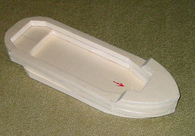 Celý trup vyřízněte z desky polystyrému silné 7-8 cm. Nejdříve nahrubo. V trupu vyřízněte a vydlabejte otvor do