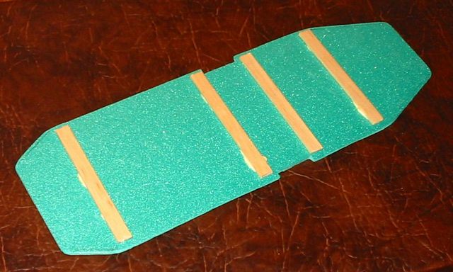 5mm desky vyřízneme tři proužky široké 5mm a dlouhé 250mm. Ty nalepíme na dno trupu. Jednu v