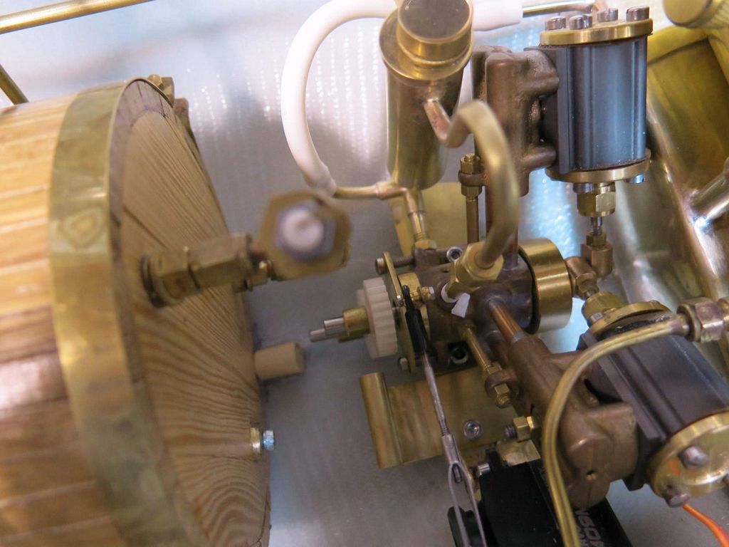 V prvom rade som sa začal venovať bezpečnosti plavby. V prípade, že ostane lodička v strede rybníka stáť, treba vypnúť plyn, aby neprehorel kotlík a nezhorela loď, ako Slaven. Tak som pod provu umiestnil uzatvárací ventil so servom. Plyn vstupuje do uzatváracieho ventila so servom, odtiaľ ide do regulačného ventila (udržuje rovnaký tlak na výstupe nezávisle od poklesu tlaku v plynojeme), z toho pokračuje do regulačného ventila, ktorý reguluje prietok plynu do horáka v závislosti od tlaku pary v kotli. Je nastavený tak, že pri tlaku 2 bar uškrtí plyn do horáka a pri poklese tlaku pary znovu otvorí plný prívod plynu.