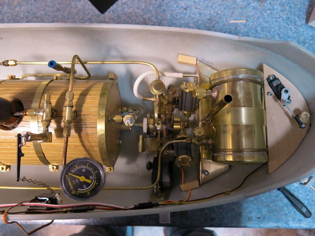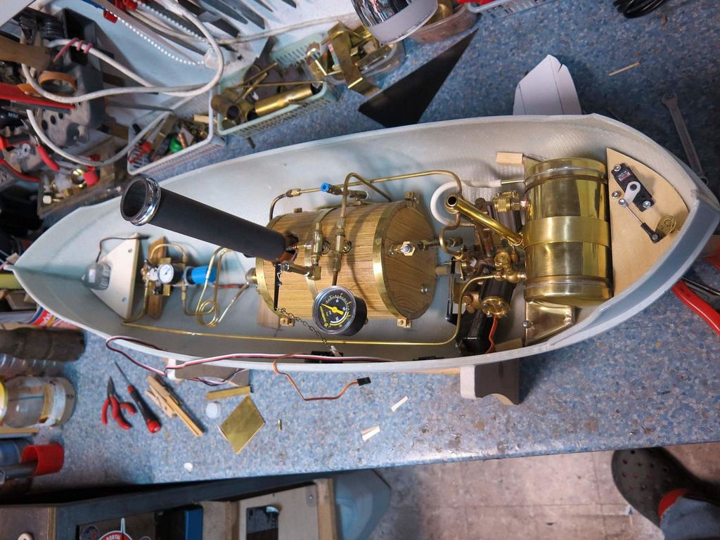 Rozmiestnenie vecí v trupe som riešil tak, aby bola prova odľahčená, nech lodička netlačí pred sebou veľkú vlnu. Stavoznak s elektródou čakajú na vhodnú elektroniku, ktorá bude signalizovať nízku hladinu vody v kotlíku. Žiadny parník nemôže byť bez píšťaly. Táto je od fy Wilesco. Petra Machatu čaká celkový pohľad do strojovne a samozrejme práca s palubou a nástavbou, pokiaľ sa tam niekde zmestia.