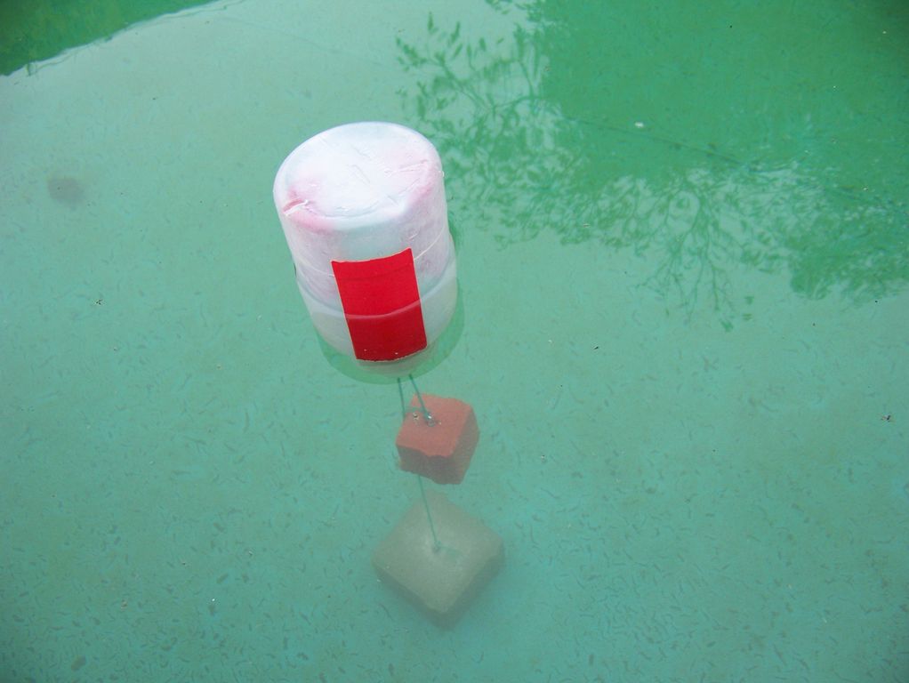 Mnou zvolené bójky pocházejí z litrových umělohmotných láhví s širokým hrdlem z armádního výprodeje, uvnitř kterých je pod víkem kousek překližky, aby závitové očko dobře drželo. Zvenčí jsou pak polepené pruhy barevné lepicí pásky, aby bylo rozeznatelné roztočení bójky při dotyku. Aby taková bójka poslušně stála, tj. byla ponořená do jedné třetiny, použil jsem jako těžší závaží dlaždici čtvercové zámkové dlažby o výšce 6 cm a stranách 10 cm, jejíž hmotnost se po instalaci hmoždinky se závitovým očkem pohybuje kolem 1250 g, jako menší závaží pak posloužila její čtvrtina.