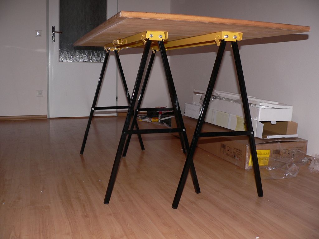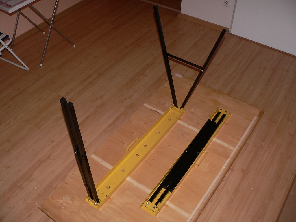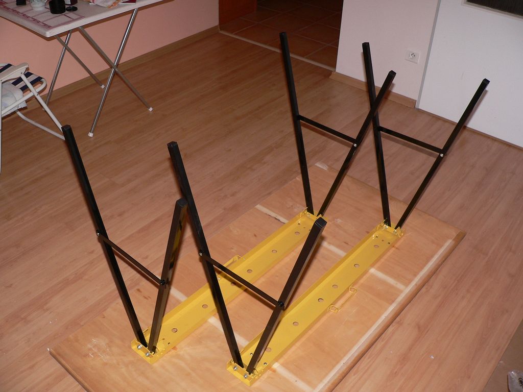 Po dlouhém hledání se mi podařilo sehnat tyto nohy. Ve skutečnosti je to kovový pracovní stojan. V OBI stál 750 Kč. Balení obsahuje dvě kozy. Výhodou je, že se nohy dají sklopit. Výška stojanu je 78 cm, šířka 48 cm, délka 102 cm. Původně jsem chtěl mít pracovní desku ve výšce 90 cm. Tuto možnost jsem zatím zamítl, to se dá dodělat dodatečně ![]()