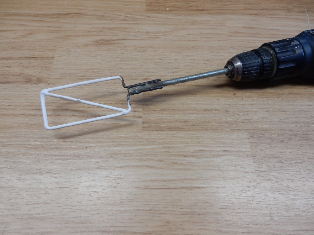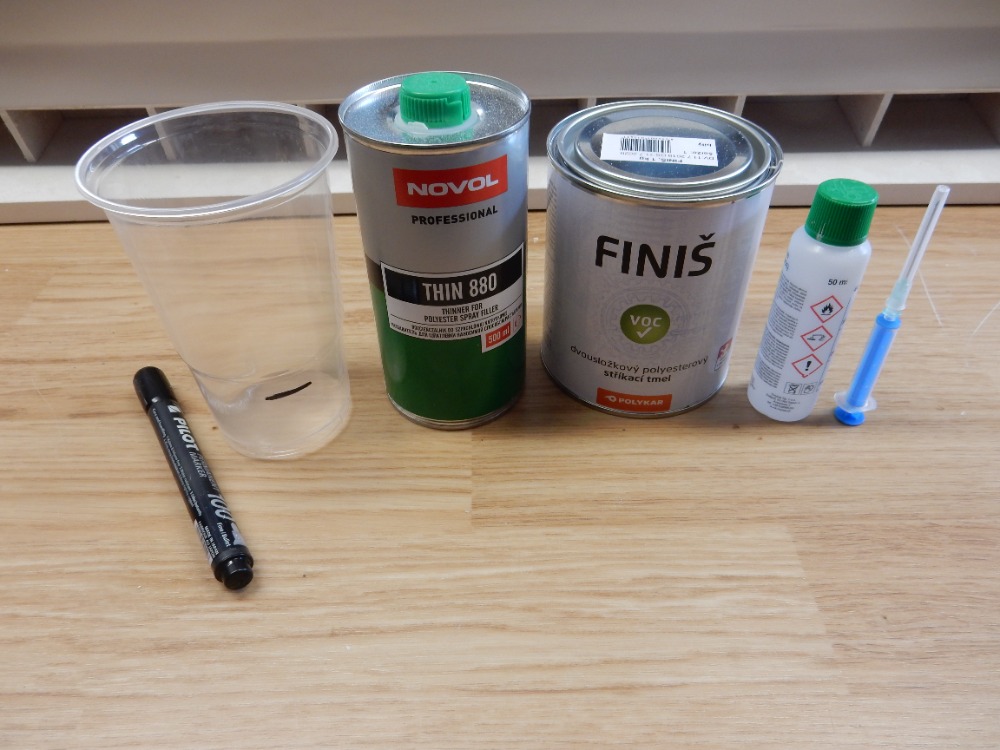 Sice možná asi popisuji zbytečné hlouposti, ale možná začínajícím usnadní, nebo urychlí práci. Jako nádobu pro namíchání používám zásadně průhledné kelímky na nápoje. Pomocí odměrného válce naliji vodu do kelímku, lihovým fixem čárku u hladiny, vodu vylít, kelímek vysušit. Nalít tmel, tužidlo pak dávkuji injekční stříkačkou se silnou jehlou. Vše je vidět na obrázku 2. Míchám metlou, kterou jsem si svařil a to pomocí aku šroubováku (obr. 3). Kdo ji sežene ze starého mixeru, je bez práce. Rychlé, přesné, čisté. Po práci kelímek do koše. Bílá barva tmelu = výborný nástřik bíle zbarvených trupů.