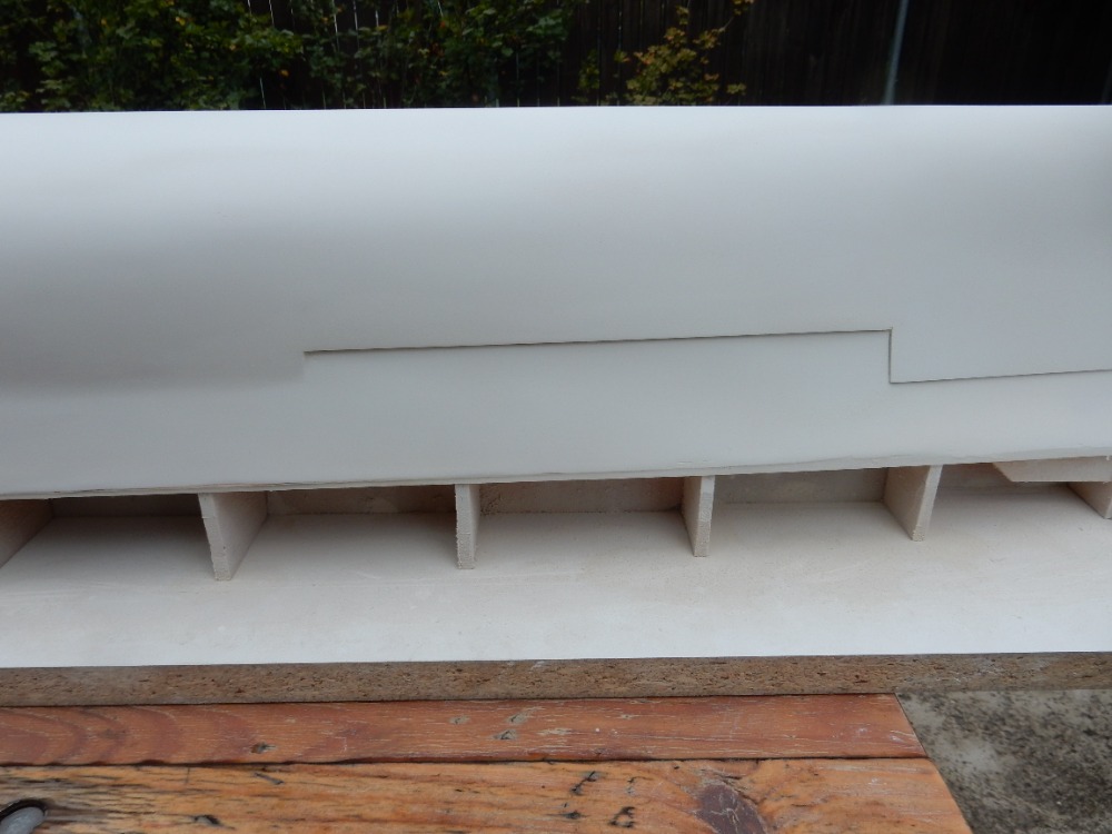Obrázkem 1 začnu tam, kde jsem minule skončil. Trup je zatmelen stěrkováním, obroušen do patřičných linií, opět nalakován epoxidovou pryskyřicí LH 160 Havel a obroušen „pod vodou“. Nyní jsem aplikoval první vrstvu stříkacího tmelu. Jako u spousty jiných věcí má každý modelář v různých nástrojích a materiálech své favority, já mám ve stříkacích tmelech FINIŠ. Tmel je dvousložkový, polyesterový, české výroby. Výrobce je POLYKAR. Barva bílá, nebo šedá. Poměr míchání 100 : 5. Doba zpracování 45 min. Nepřilnavost prachu po 60 min, doba schnutí 120 min. Cena 243,- Kč včetně DPH za 1 kg. Tmel lze ředit i ředidlem nitro, ale není to ono. Na čištění pistole bez problémů, ale ředím radši originálním polyesterovým ředidlem. Já používám THIN 880 od firmy NOVOL. Cena je sice 100,- Kč za 0,5 litru, ale ředí se poměrně málo, tak vydrží.