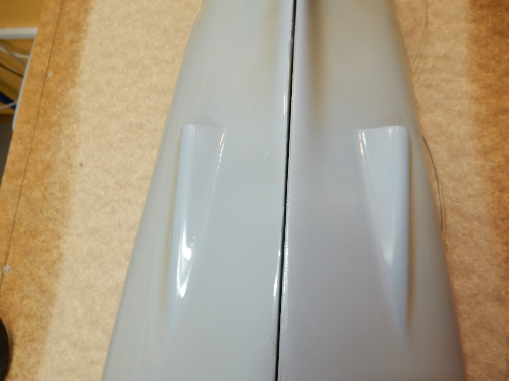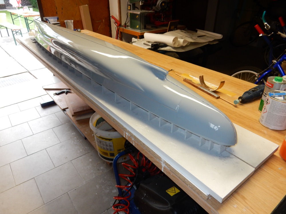 V tomto okamžiku dostává trup první nástřik barvou. Výrobce tmelu FINIŠ uvádí možnost použití jakéhokoli druhu barvy nebo plniče. Nevolil jsem nitro. Brzy schne, ovšem při tomto měřítku trupu až moc rychle. Volil jsem syntetiku, šedou, vysoký lesk. Plnič jsem zavrhl, možná jsem neměl. Trup jsem před nástřikem odmastil lihem. Nástřik proběhl krásně, barva schne dlouho, ale nádherně se rozlila. Ovšem po zaschnutí jsem pozoroval mikro bublinky v povrchu barvy. Po zaschnutí jsem obrousil pod vodou a dal druhý nástřik. Na obrázcích 12 a 13 je výsledek. Myslím, že dostačující.