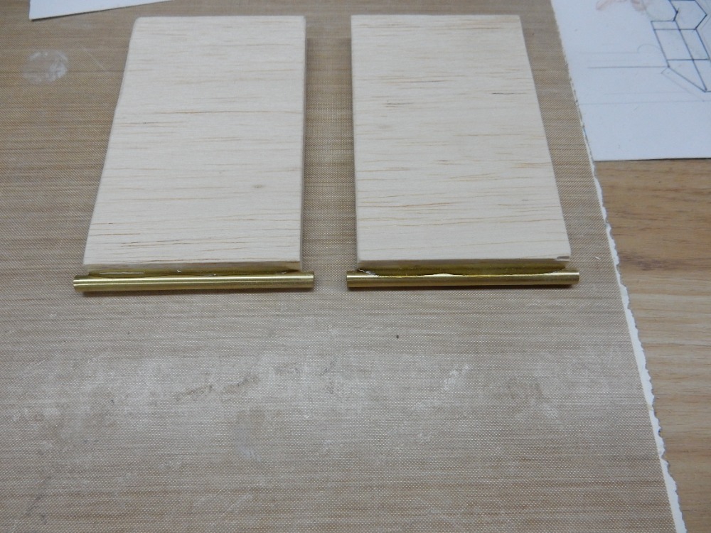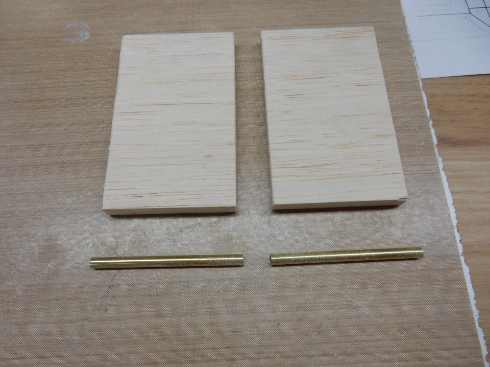 Druhou částí jsou výběhy hřídelů bočních šroubů. Pokusím se v krátkosti popsat přípravek, který zaručí stejný sklon hřídelů, jejich rovnoběžnost vzájemnou i s kýlem lodi. Uříznul jsem dva kusy trubiček o průměru 4 mm tak dlouhých, jako je vzdálenost od trupového výběhu k zadní podpěře šroubu. Zároveň jsem uřízl a zabrousil dva kusy obdélníků z balzy (obr. 16). Trubičky jsem k balzovým dílcům přilepil (obr. 17).