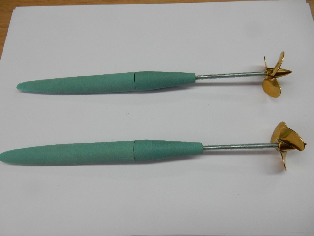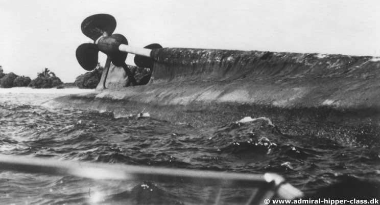 Poslední snímek ukazuje, jak po demontáži můstku a poloviny výběhů zůstávají základní, zkosené části na trupu lodi. Rovnoběžné, stejně skloněné, souměrné s kýlem (osou lodi). Viz obrázek 32. Následuje vytmelení a vybroušení přechodů hřídelových výběhů k trupu tak, jak je tomu ve skutečnosti. Nemá to takto ani jedna stavebnice, není to patrné ani z plánů. Skutečnost odhaluje až foto z vraku lodi (obr. 33). Stačí pomocí patřičně vybroušené stěrky vytmelit a vybrousit (obr. 34 a 35). V barvě to pak nevypadá špatně (obr. 36).