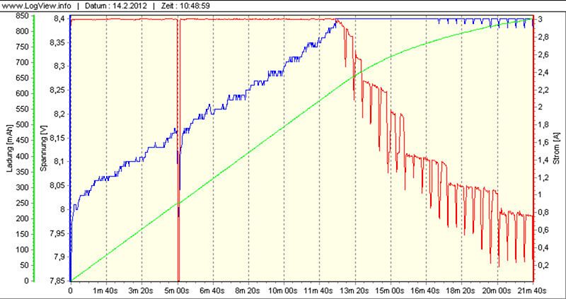 Po vybíjecím testu jsem ji ještě do mrtva vybil proudem 0,1 A, protože se samozřejmě trošku vzpamatovala. Po vybití následovalo nabíjení. Dodaná energie nabíjením byla 3,5 Wh, 623 mAh.