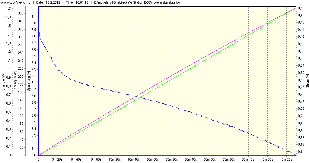 Na ukázku, takto může vypadat vybíjecí charakteristika 2S Li-ion baterie US18650S při vybíjecím proudu 0,5 A. Baterka byla před testem nabita. Jak je vidět už zdaleka nemá kapacitu 1100 mAh. Odebraná energie zde byla 1,7 Wh, 374 mAh.