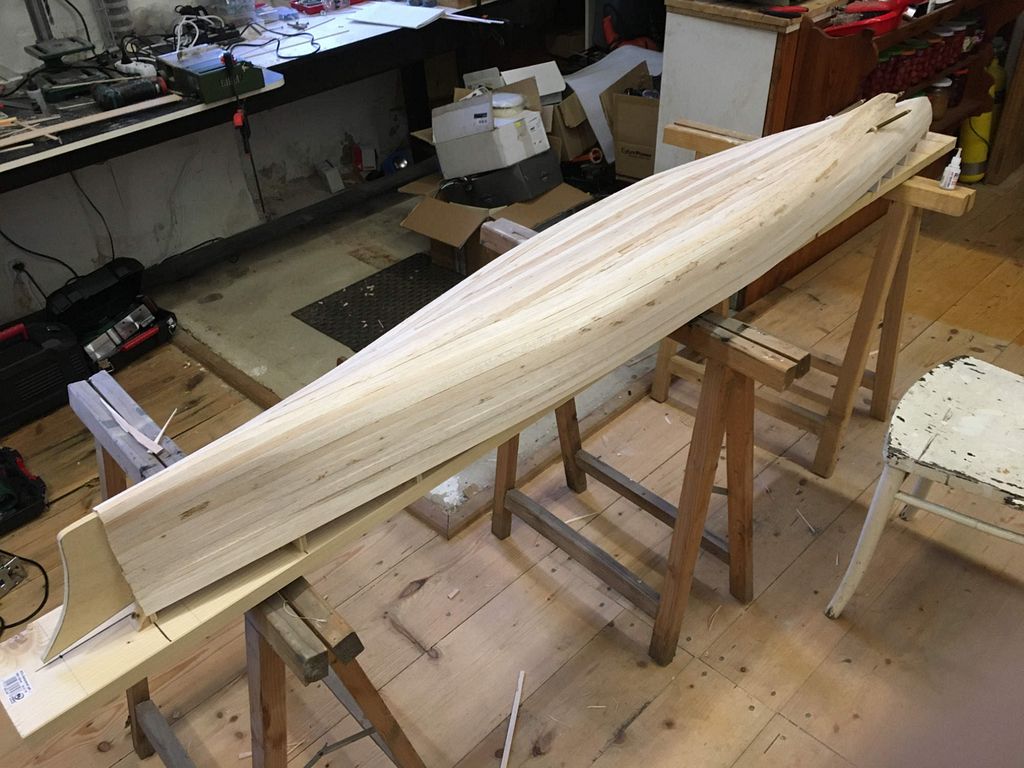 Samotná stavba již probíhá klasicky: překreslit žebra na překližky tl. 8 mm, svrtat otvory pro nosné kulatiny a celou kostru umístit na pracovní desku – v mém případě spíš pracovní fošnu. Následně došlo k umístění hřídelí a motoru. V modelu jsou tři kusy MIG 500 Turbo 12V na hřídelích MP JET s přírubou – dle mého nejjednodušší a nejspolehlivější řešení. Asi nejoblíbenější část stavby následuje– oplaňkování balsou tl. 4 mm, po kterém loď konečně dostane tvar. Posléze nahrubo zatmeleno, obroušeno a přes balzu dvě vrstvy lamina. Pak přichází naopak nejneoblíbenější část – tmelení a broušení.