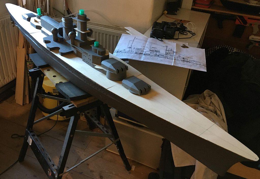 Když bylo potvrzeno, že loď plave a pluje, pustil jsem se do vrtání a osazování okének (cca 170x na každé straně) dále nahrubo připravená paluba a začátek formování nástaveb. Od začátku bylo jasné, že se věže budou otáčet – proto je pod každou věží umístěno servo s rozšířeným úhlem otáčení na 270° a zpomalovačem.