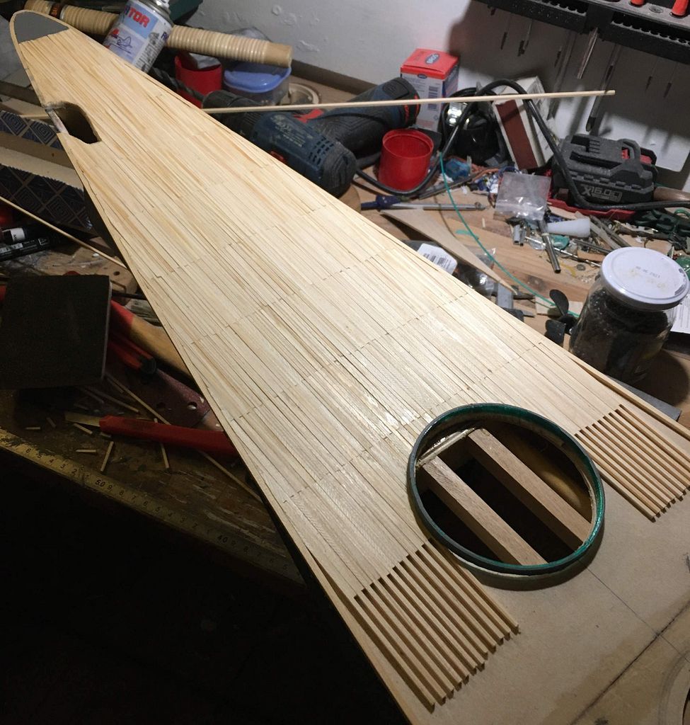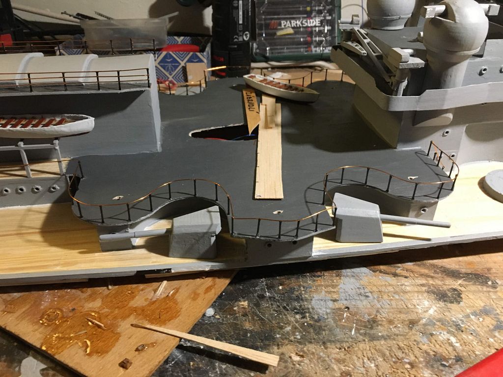 V průběhu řešení všech funkčních prvků na lodi docházelo k postupnému dodělávání paluby, ta je celá seskládána ze smrkových lišt 2x2 mm délky 10 cm, celkem na palubu padlo 140 metrů. Další poměrně dlouhou činností byla výroba zábradlí. Sloupky jsou z uhlíkové kulatiny zavrtané a zalepené do paluby (přeci jen se jedná o nejčastěji ulámaný detail na lodích) a vodorovné žbrdlení bylo proti původnímu plánu (režná nit) uděláno z měděného drátu z důvodu vytvarování oblých částí.