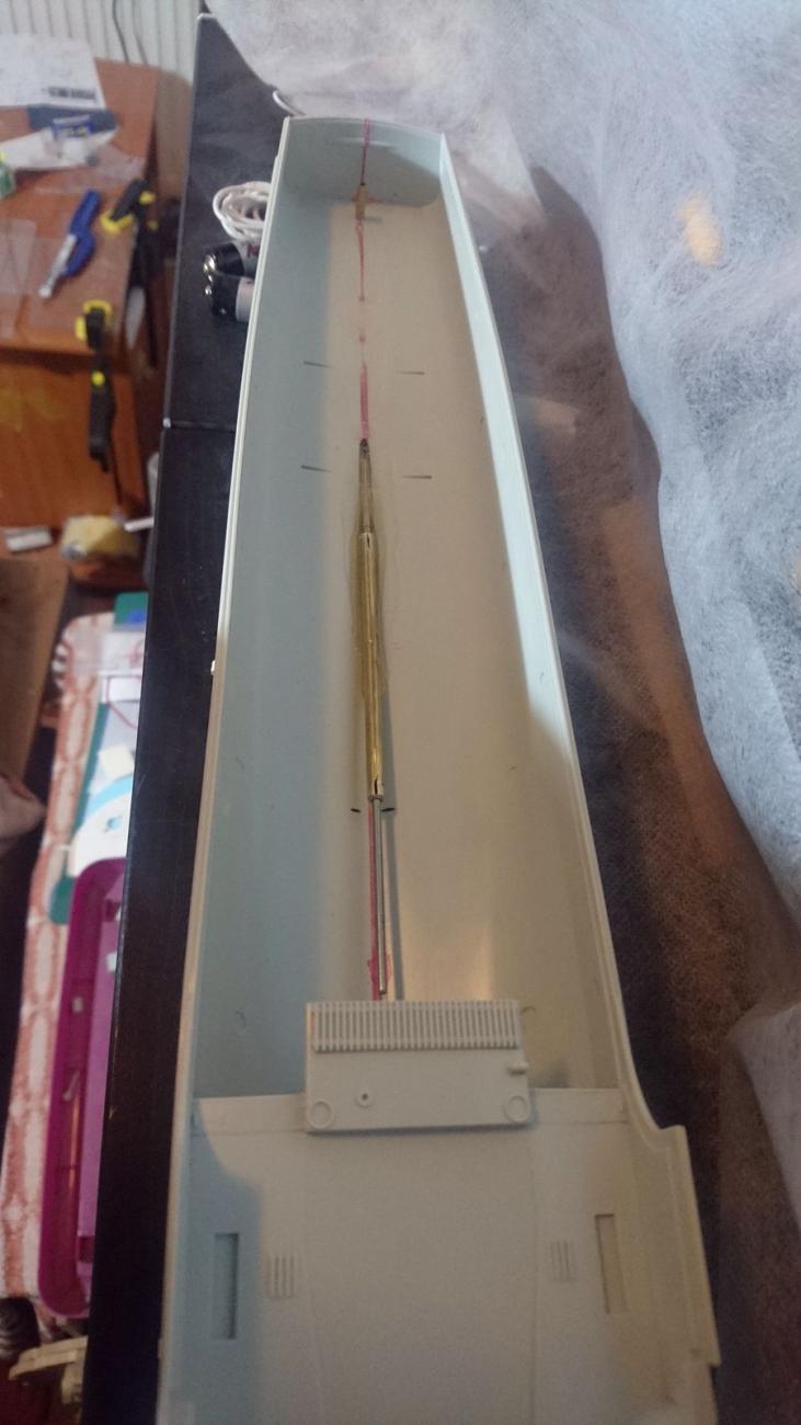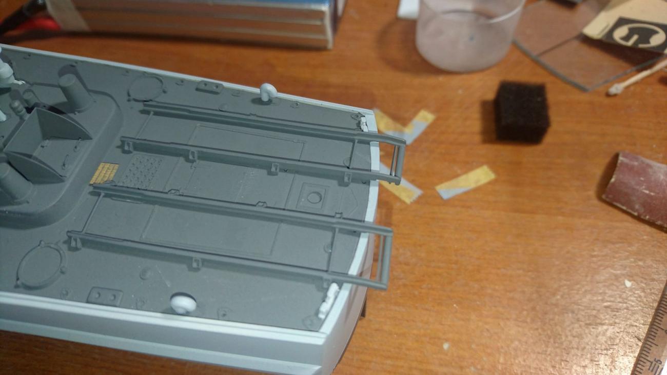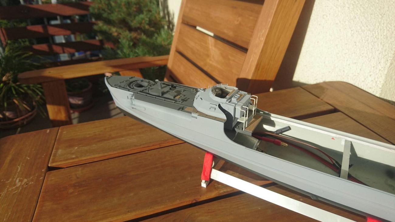 Slepení polovin trupu dohromady bylo snadné. Při pokusech, jak bude sedět paluba a jak vyřešit vstup do podpalubí, jsem však zjistil, že paluba je lehce do vrtule. Obyčejnému statickému kitu by to nevadilo, paluba by se vlepila, ale zde to byl zásadní problém. Řešením se stalo vyztužení paluby ze spodní stany dvěma podélnými nosníky z uhlíkových vláken, které jsou lehké, tuhé a nenasávají vodu. Na straně trupu pak bylo pomocí malých pruhů z Forexu zvětšeno lůžko, na které bude doléhat paluba. Další nepřesnost byla zjištěna při slícování můstku s palubou, kde vznikla cca 1 - 1,5 mm mezera. Tedy nic, co by nešlo zakytovat. Pro zajištění vstupu do podpalubí byla hlavní paluba rozříznuta hned za můstkem, takže přístup je téměř do celé zádi. Příď je nepřístupná, pouze je do těch míst zasunut přijímač a malý regulátor.