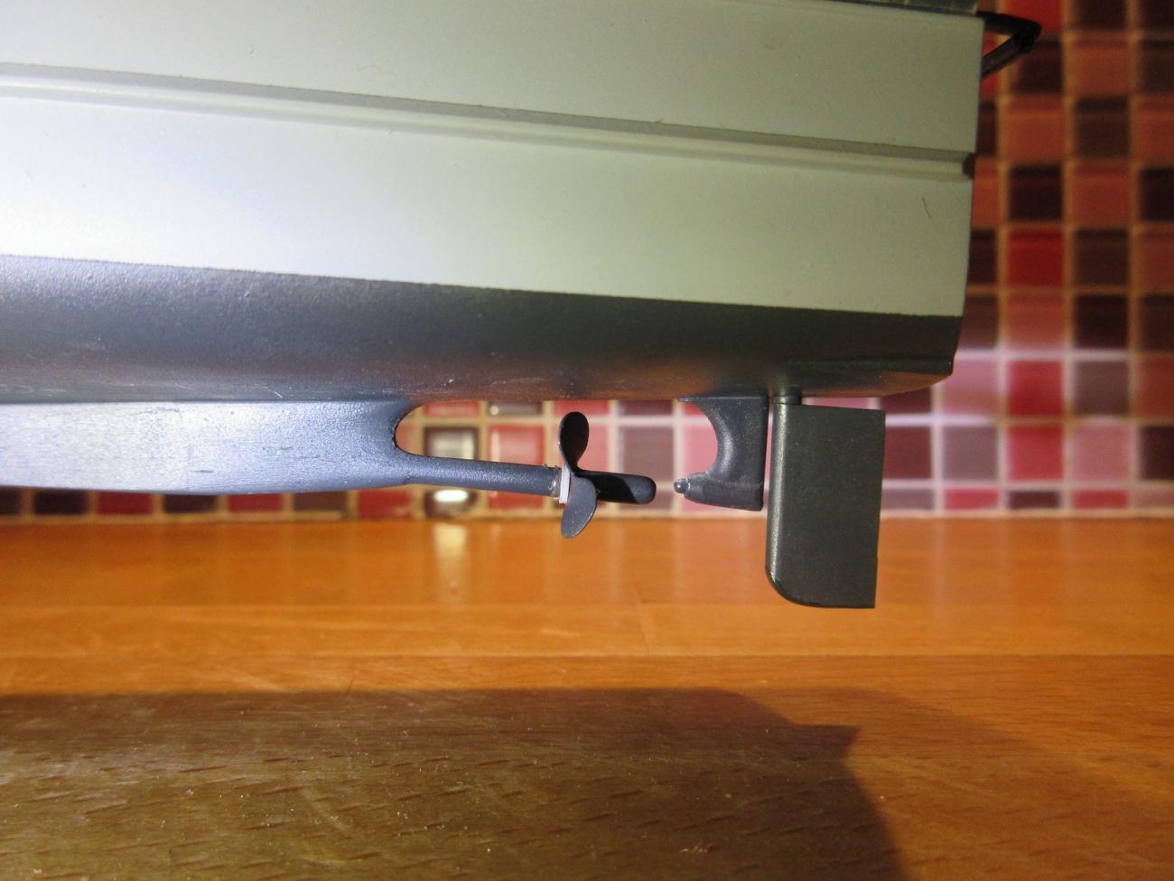 Středová hřídel předlohy je v oblasti špičky lodního šroubu ukotvena kozlíkem ke dnu člunu a hned za kozlíkem se nachází kormidlo. V modelovém měřítku je však toto řešení dost problematické, a abych se vyhnul komplikacím, rozhodl jsem se aplikovat standardní trubičkové pouzdro po celé délce hřídele s ložiskem těsně před šroubem. Vně trupu je tedy celá hřídel zapouzdřena, což brání jejímu nežádoucímu rozkmitání. Po prvních plavebních zkouškách jsem také zvětšil kormidlo o cca 20 % směrem dolů. Více je pochopitelné spíše z fotek.