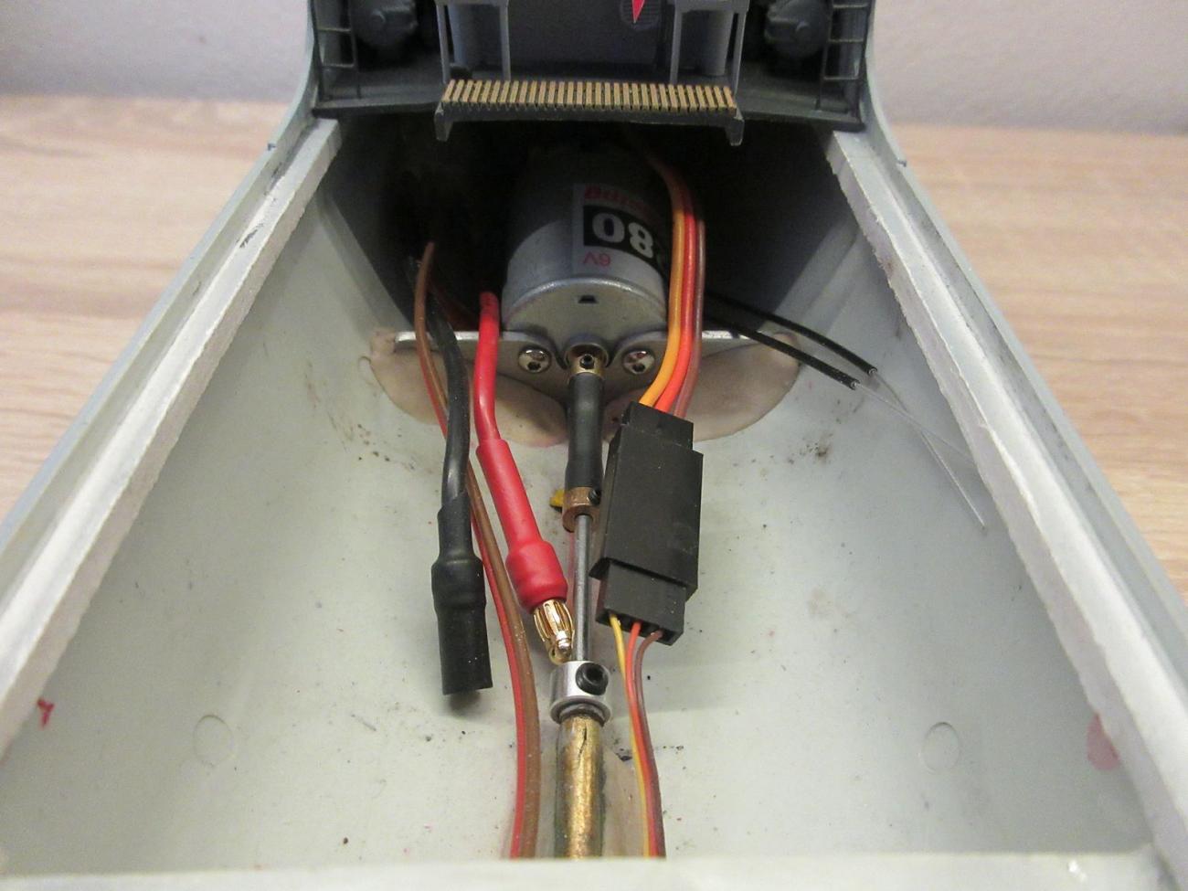 Stavba začala vymýšlením pouzdra hřídele a slepením obou polovin trupu dohromady. Model je poměrně malý a úzký, takže příliš prostoru k rozletu nedovoloval. Předloha disponuje třemi lodními šrouby a kormidly, zde v modelovém měřítku jsem však zvolil jen jeden šroub středový a stejně tak i kormidlo. Kvůli malému místu pod trupem byl použit šroub „vyMOdelovaný NA KOleně", získaný od přátel z Těšína. Jeho průměr činí 15 mm a je našroubován na 2mm hřídel spojenou napřímo s motorem. Zkoušel jsem i šrouby průmyslově vyráběné, ale všechny jsem musel zbrušovat na potřebný průměr a při plavebních testech se nechovaly tak dobře.