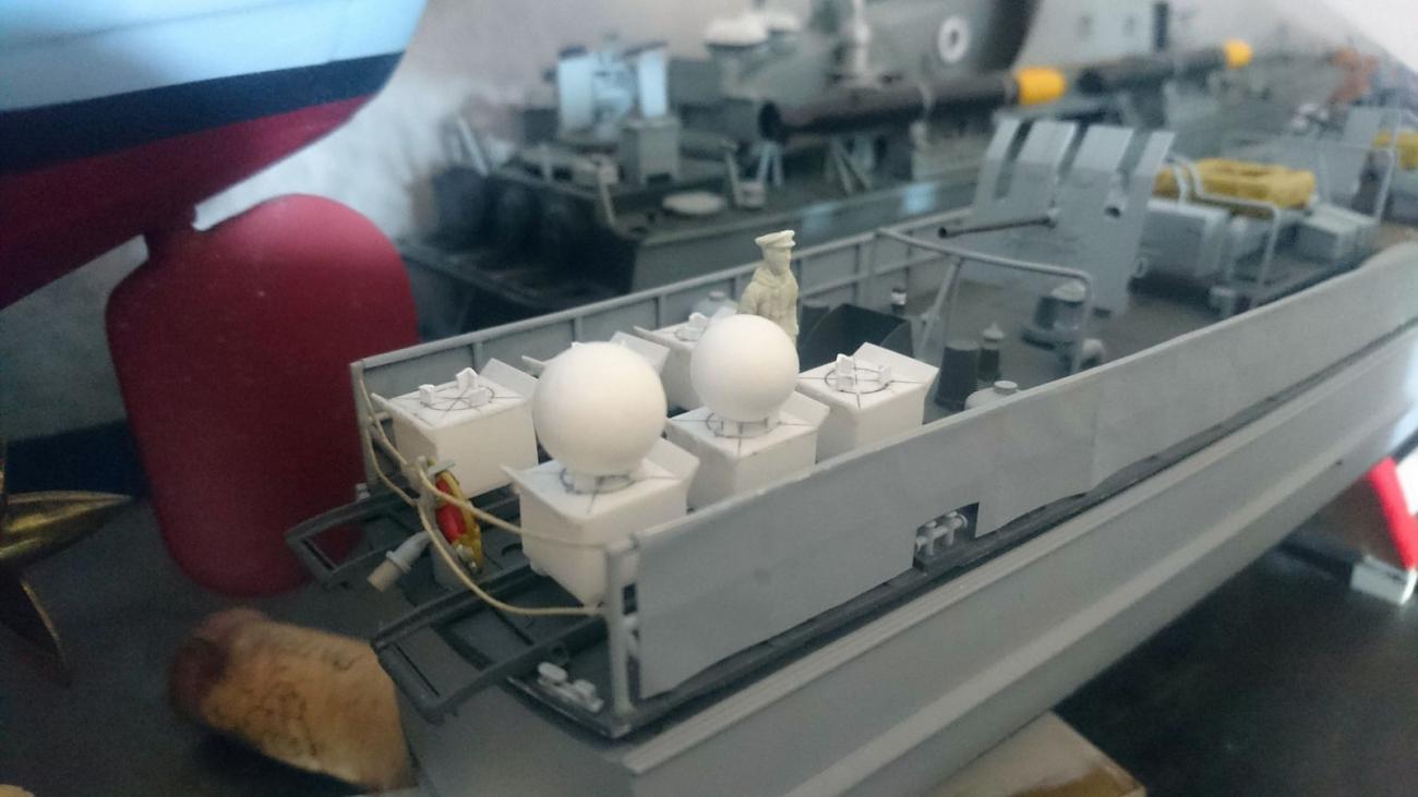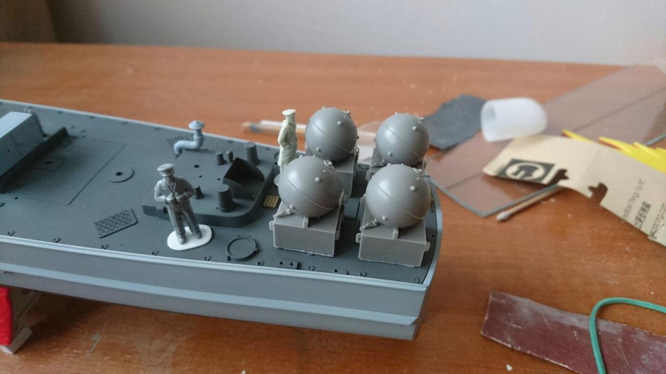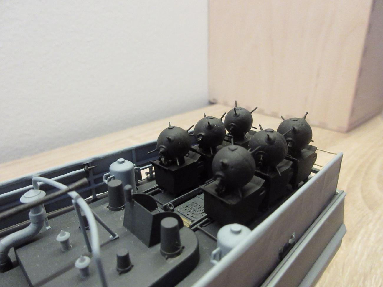 Verze mé stavebnice S-100 je na zádi osazena dvěma kolejničkami pro shoz min. A jelikož záď bez min vypadala celkem prázdně, tak jsem se je rozhodl doplnit. Ohledně kolejniček jsem při dokončovacích pracích narazil. Na základě mnoha různých fotek z internetu jsem usoudil, že provedení kolejniček ve stavebnici je naprosto špatně. Takže jsem dotyčné díly upravil po svém a vytvořil dle mého názoru realistické kolejničky. Pokud jde o miny, firma CMK sice vyrábí poměrně hezké doplňky pro diorámy v měřítku 1:72, avšak pořízené miny byly moc veliké. Na základě informací publikovaných na webu www.navweaps.com a www.s-boot.net jsem odhalil, že zatímco „plnotučné“ sférické miny (označení EMC) měly průměr 112 cm, tak na rychlých člunech byly používány miny menší, s označením UM (UMA, UMB) a průměrem 84 cm. S čímž souvisí i velikost jejich vozíku. Nezbývalo, než miny vyrobit a ideálně velmi lehké. Čirou náhodou jsem zahlédl na rybářském e-shopu polystyrenové kuličky o průměru 1 cm (přesně podle měřítka by měly nálože mít průměr 1,17 cm, ale budete to měřit?), které slouží na nadnášení návnady. Vozík je pak krabička vytvořená z polystyrenových destiček o tloušťce 0,5 mm. Trčící detonátory jsou z nejtenčích drátků, co jsem doma našel. Vše natřeno černou akryl barvou a lehce přestříkáno matným lakem.