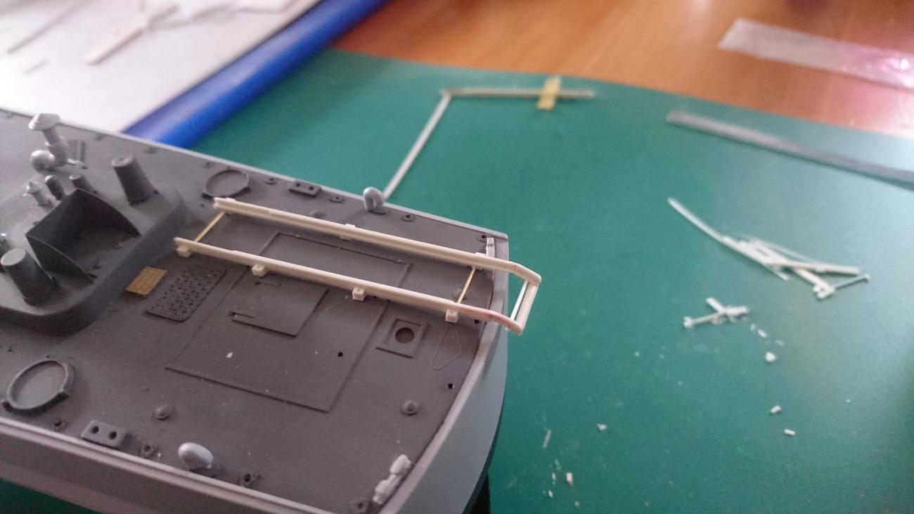 Kromě toho jsem se pokusil aplikovat plachtové výplně do bočních zábradlí a rozhodl jsem se je vytvořit z alobalu nastříkaného barvou. Protože jsem je dodělával tak nějak živelně až po usazení zábradlí, postupoval jsem tím způsobem, že se nejprve upnutý alobal nastříkal po obou stranách, a pak se odměřily a vystřihly pruhy potřebné velikosti. Nahoře byl vytvořen drobný záhyb kolem horní tyče zábradlí a celek byl na pár místech k zábradlí fixován sekundovým lepidlem. Dalším vylepšením byly antény vytvořené z vysoce strečového vlákna, jež se dokáže perfektně napnout, aniž by způsobilo zlomení přichycených dílů.