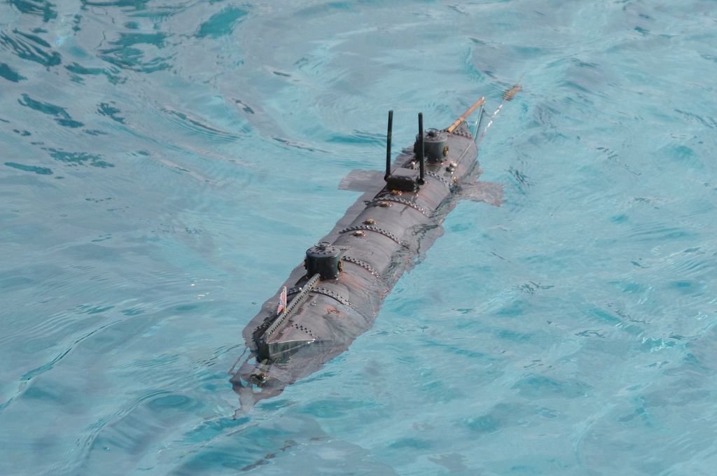 Dalším ze zajímavých minimodelů byla historická ponorka Turtle s dynamickým ponořováním, i když předloha a stejně tak model nevynikají rychlostí pohybu. Těsný trup modelu se zdroji a přijímačem vyplňuje jen část prostoru uvnitř, oba ploché stejnosměrné minimotory (pohonný i ponořovací) jsou v zaplavované oblasti. Asi moc dlouho nevydrží, ale dají se poměrně snadno vyměnit a jsou levné.