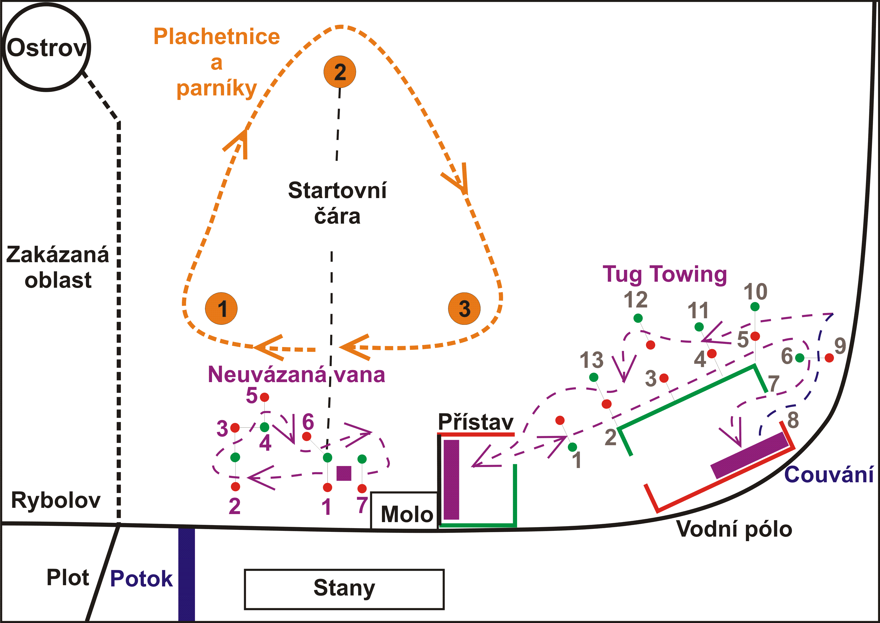 Po celou dobu lze na vodě provozovat veškeré momentálně nesoutěžící modely mimo soutěžní dráhu na nekolidujícím kanále - přednostní právo na kolíček opravňující k provozu RC soupravy bude mít ten, jehož model spadá v daném čase do preferované soutěžní skupiny.