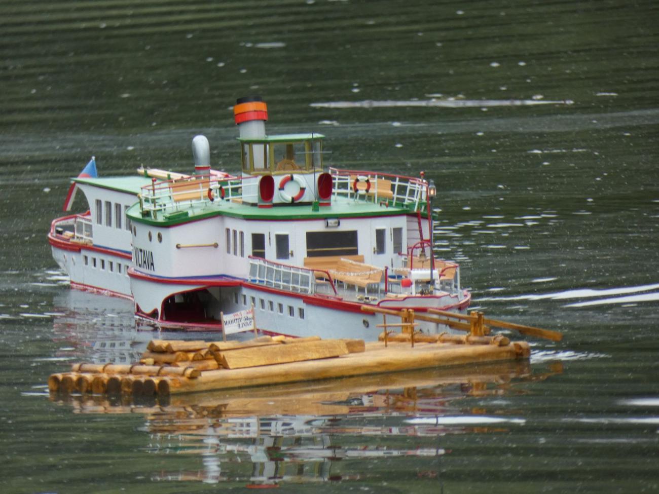 Kromě kolesových lodí mohu zmínit zajímavou ukázku RC voru Josefa Kubeše, hlavního pořadatele a autora myšlenky takto specializovaného srazu. Bohužel díky vodnímu nepořádku ujel jen několik metrů, než něco namotal do lodního šroubu. Podobný osud potkal i další lodě s lodním šroubem.
