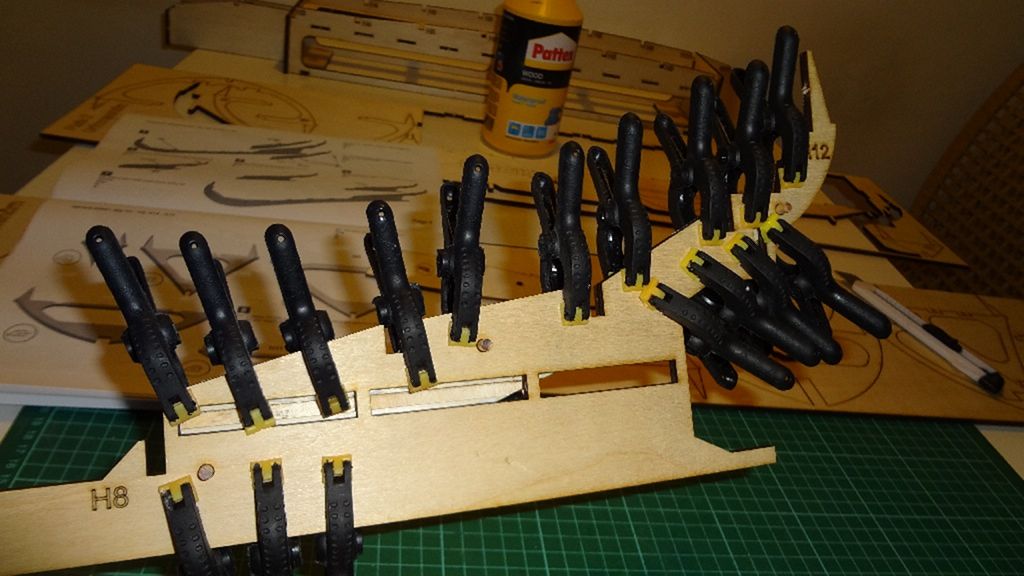 Při lepení vteřinovým lepidlem navíc téměř odpadla potřeba používat různé svěrky, lišta prostě drží už chvilku po odvětrání aktivátoru a těch pár vteřin jde vše držet prsty. Jakmile je plaňkování dotaženo k páteři lodi, zbývá lišty odříznout s hranou prvního a předposledního žebra.