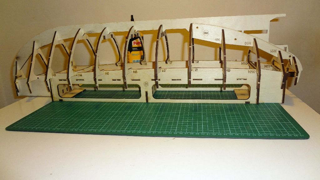 Nyní je na řadě nástavba, ta je kompletně zhotovena z topolové překližky 3 mm. Možná to je trošku „retro“ přístup, dnes je spíš zvykem používat plastové desky a různé profily, ale my chceme dřevěnou loď… Nejprve si připravíme kostru budoucí nástavby, ta mi přijde velice subtilní, nicméně bez potíží k této konstrukci lepím obě bočnice, které je třeba prohnout.