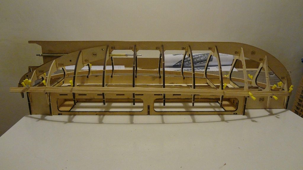 Poté sestavuji nasucho kostru, vše do sebe správně zapadá, povrch trupu vypadá pěkně plynulý, tak kostru slepuji. Na montážním přípravku snad nejde nic splést a celek je krásně pevný, takže plaňkování by mělo probíhat bez potíží.