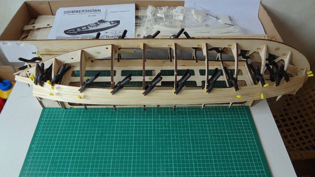 Z překližky 5 mm je také stojan, který na dosedací ploše opatříme vhodným měkkým materiálem, já jsem použil gumové těsnění do oken. Vše ve stavebnici je řezáno laserem s vynechanými můstky, které musíme proříznout. List pilky Zona je na tuto práci příliš široký, proto používám odlamovací nůž a z obou stran můstky nařezávám. Je to docela fuška, ale díly se hromadí a pěkně pasují. Řez je od laseru opálený a výrobce doporučuje tuto zuhelnatělou vrstvičku strhnout brusným papírem. Po sestavení montážní základny připravím všechna žebra a ta krajní dle návodu na hranách lehce sbrousím, aby lišty obšívky přiléhaly pěkně v ploše. Také připravuji páteř lodi, do které zalepuji pouzdro lodní hřídele a pouzdro hřídele kormidla.