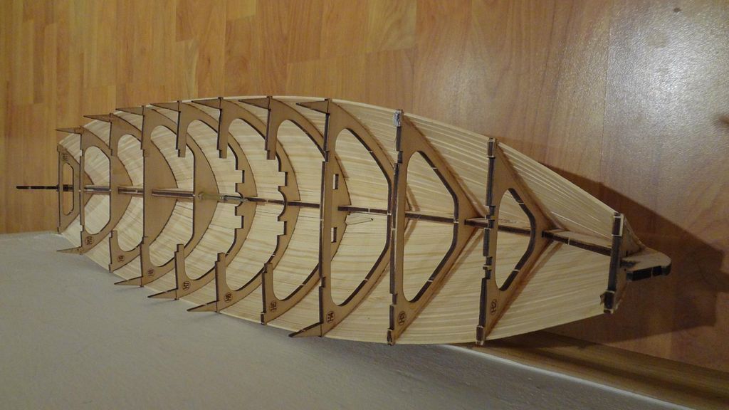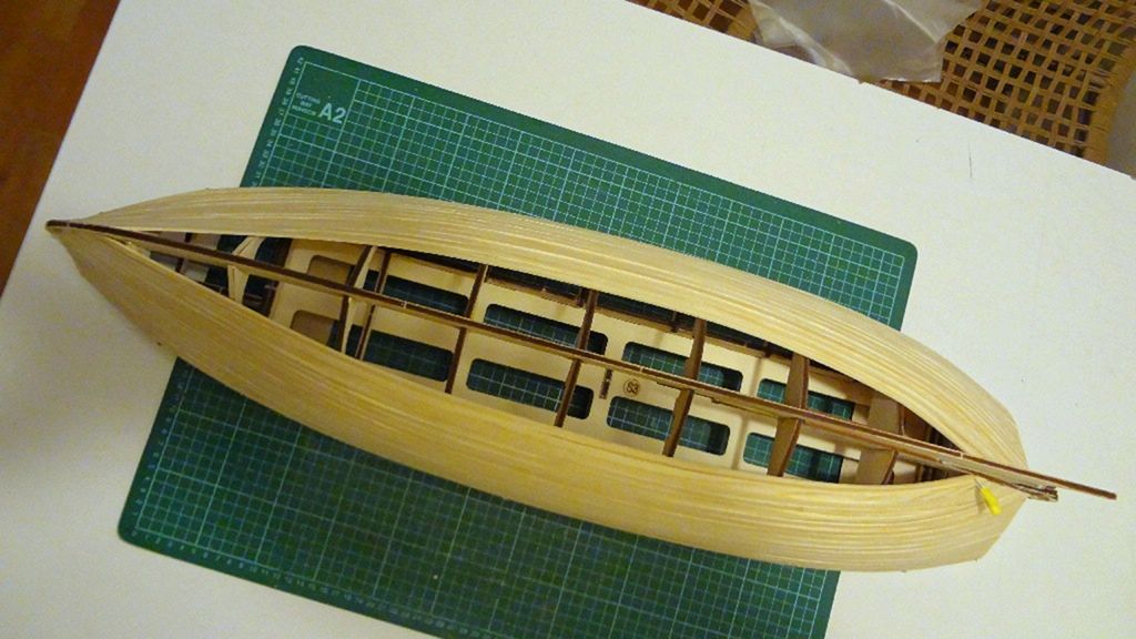 Výrobce dodává smrkové lišty tloušťky 2 mm a šířky 7 mm, ty jdou pěkně ohýbat, tak je ani nenamáčím. Ještě musím uvést, že jsem dosud vždy dával přednost při plaňkování balze, lépe se brousí a trup lodě stejně laminuji. Ale návod je návod… První plaňka se umístí pod bort na připravené výstupky určující její „výšku na žebru“, jen byl problém v tom, že nenamočená lišta se málo prohnula a v místě přídě a zádě vytvořila přímější linii. To by způsobilo komplikaci - později by zde plynule nenavazovala paluba. Proto výrobce doplnil do konstrukce trupu mezi koncová žebra překližkovou „šablonu“, která zajistí tvarovou přesnost.