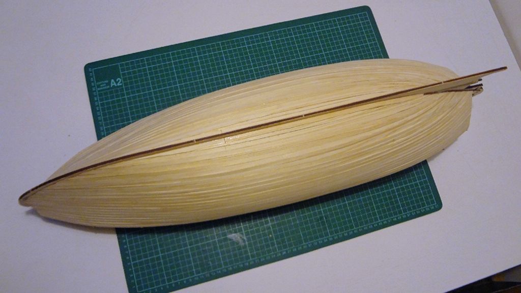 Dále už pokračujeme v plaňkování a plynule navazujeme jednotlivými lištami směrem ke kýlu. Zpočátku můžeme postupovat s lepením neupravovaných lišt, posléze je třeba zužovat konce lišt. Lepil jsem nejprve lepidlem na dřevo, ale posléze jsem přešel na vteřinové lepidlo doplněné aktivátorem ve spreji. Potom už šla práce opravdu rychle, samozřejmě jsem postupoval střídavě na obou stranách trupu.