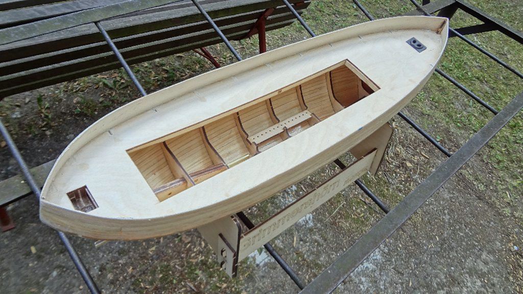 Dalším krokem je nalepení paluby z překližky 3 mm, kde jsou laserem naznačena prkna paluby. Tento díl jsem z obou stran nalakoval. Lepení byl trošku oříšek, paluba má prošlup, a tak přišel opět ke slovu aktivátor a vteřinové lepidlo. Nejprve jsem ale ze spodní paluby odstranil přebroušením barvu z míst, kde budu lepit, potom jsem 5min epoxy přilepil palubu uprostřed okolo rámečku vstupu do podpalubí. Potom jsem postupně lepil „odstávající“ okraje tak, že jsem do mezery mezi palubami nanesl z lahvičky s teflonovou trubičkou „tak akorát“ lepidla, zastříkl aktivátorem a přitisknul. Stisk nesmíme uvolnit příliš brzo, jinak celý postup opakujeme. Na vrchní hranu bortu přijde lem, opět z plastu, který po nástřiku černou barvou postupně lepím vteřinovým lepidlem, plastičnost hmoty dovoluje potřebné vytvarování. Na přídi a zádi díly lemu překryjeme připravenými tvarovkami. Dolepíme plastové úvazníky dvou velikostí a tím můžeme na nějakou dobu trup odložit.