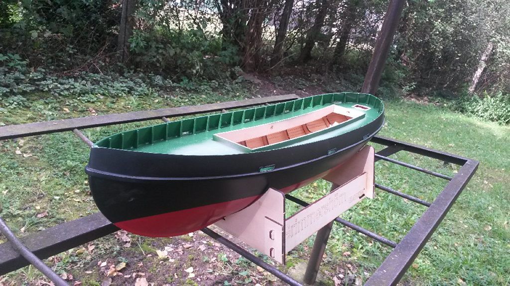Zevnitř bortů jsem postupně vlepoval výztužná plastová žebra, na dodržení rozteče a kolmosti je ve stavebnici šablona. V bortu je třeba vyfrézovat v úrovni podlahy na každé straně 4 obdélníkové otvory pro odtok vody, začistíme je vložením plastových tvarových dílů. Otvor v palubě olemujeme překližkovými pásnicemi, které vystupují nad úroveň paluby a na které bude dosedat nástavba. Následovalo již zmíněné stříkání plničem s přebroušením smirkem 240, další plnič na vnější stranu trupu s přebroušením smirkem 500, poté základovka přebroušená smirkem 800. Trup potom ustavíme do roviny a vyznačíme čáru ponoru. Barvy jsem stříkal podle schématu výrobce, tedy pod čarou ponoru červená, paluba a vnitřní strany bortů zelená, zbytek černá. Tím máme trup barevně dokončený a vše, co dále doplňujeme, je třeba barvit před montáží.