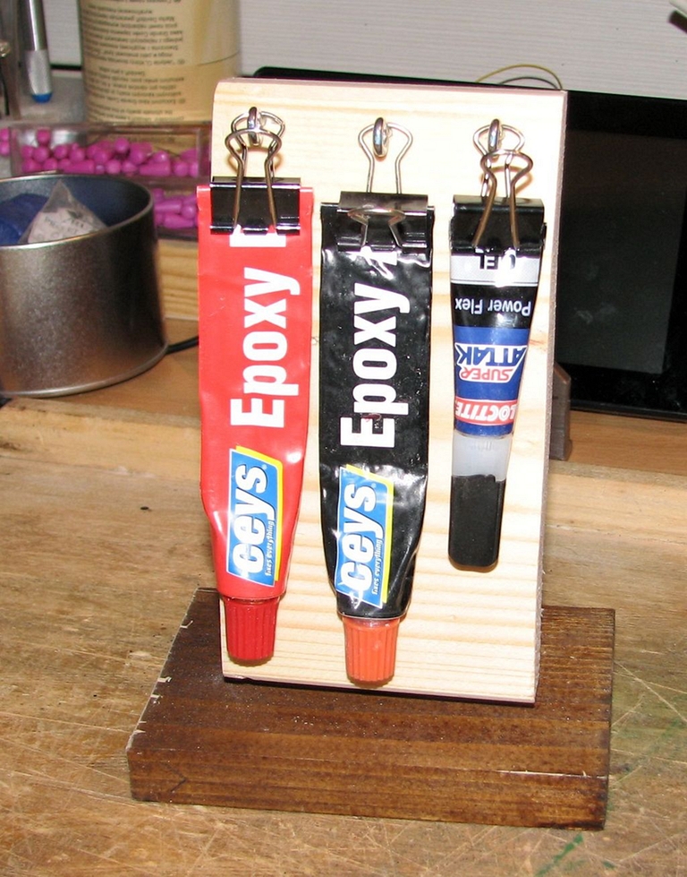Dílo je hotové max. za 10 minut. Teď stačí po zavření tubu zavěsit. Už ji nehledám. Vždy okamžitě k dispozici a navíc nehrozí, že třeba sekundové lepidlo rozplácnu narychlo odloženým kladivem. Plně se mi osvědčil malý stojánek na tři tuby. Megalomanství se meze nekladou ![]()