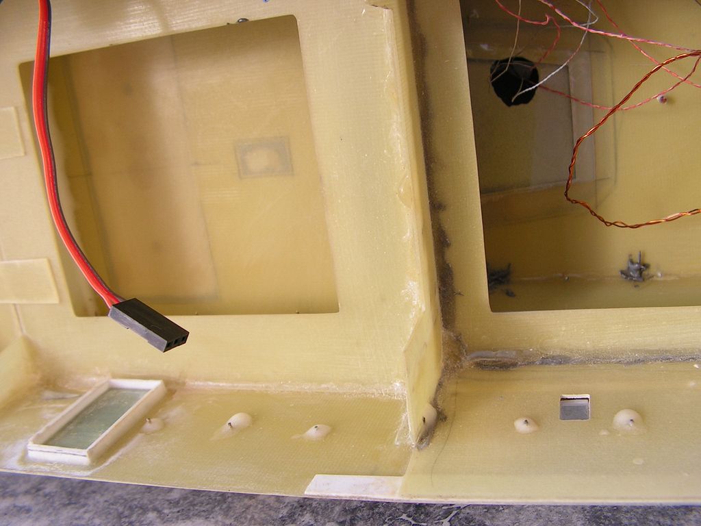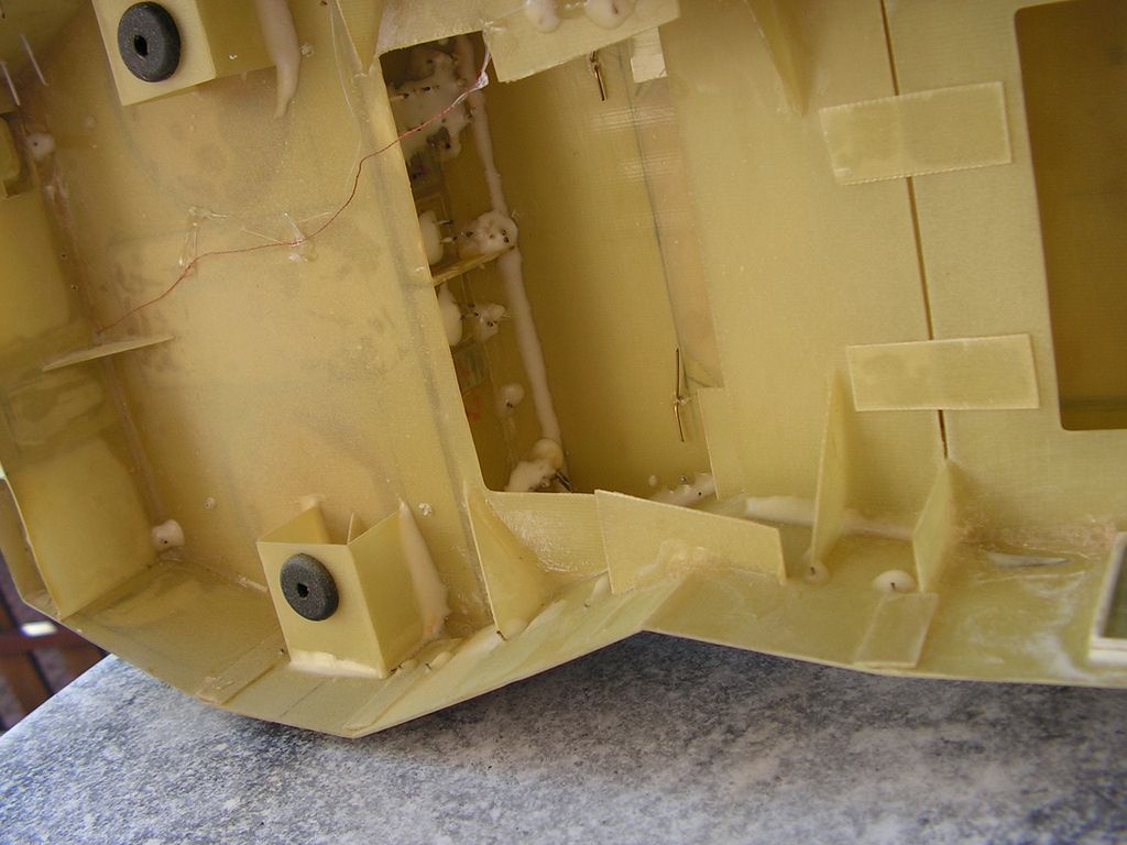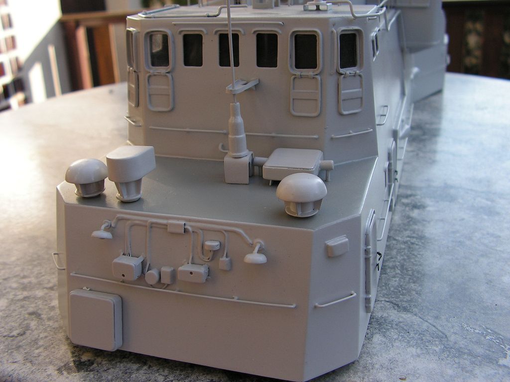 Nástavba je svým tvarem asi to nejsložitější, co jsem zatím lepil, proto je vybavena spoustou pomocných žeber, která pomáhají držet její tvar a geometrii. Hlavním materiálem pro nástavbu jsou laminátové desky 0,76 mm. Všechny spoje jsou lepeny 5min. epoxy a po zaschnutí jsou vnitřní rohy zalité Epoxy 1200 s příměsí mikrobalonů.